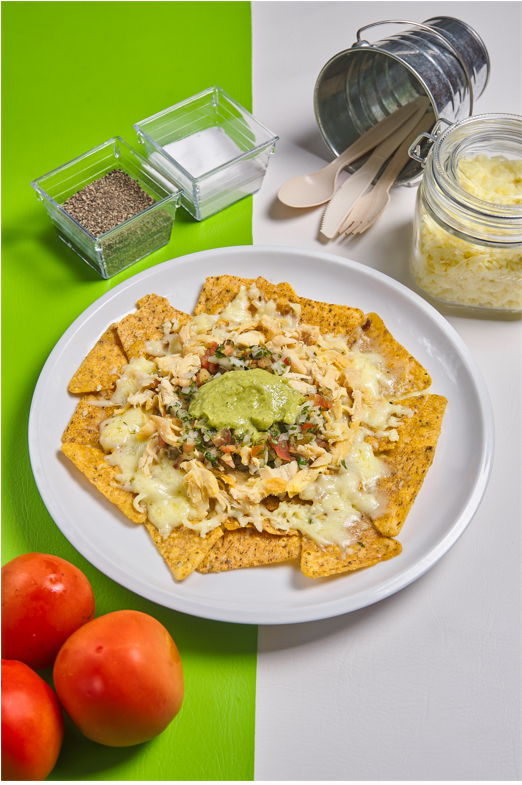 Para los que prefieren una opción diferente: nachos, pollo, queso mozzarella, pico de gallo y guacamole.