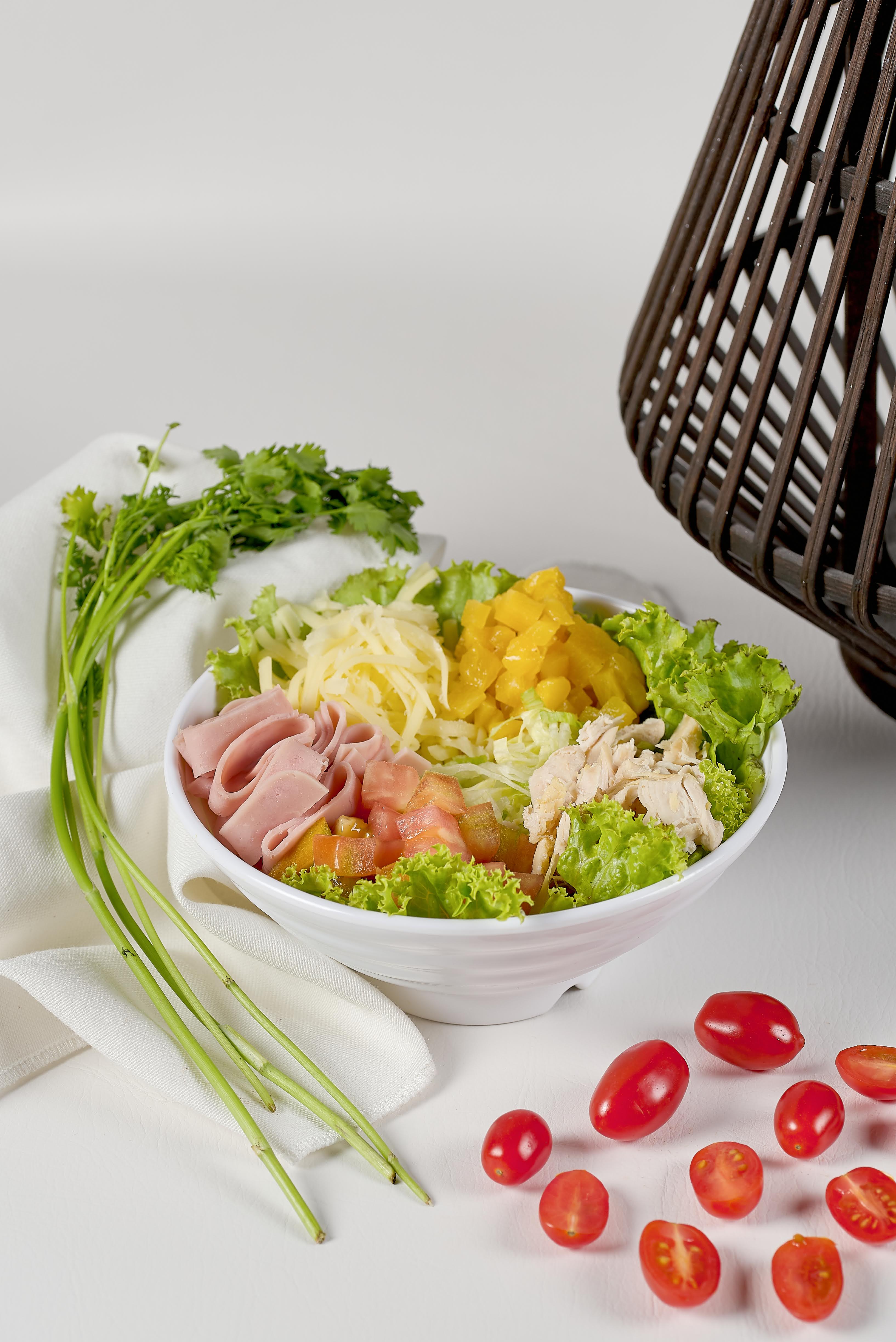 Ensalada con lechuga, tomate, piña, jamón, pollo y queso.