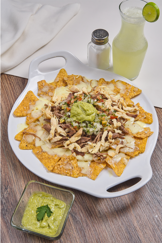 Pruébalo todo: nachos, carne, pollo, queso mozzarella, pico de gallo y guacamole.