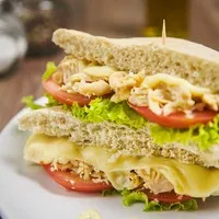 Lechuga tomate, pollo queso y cebolla caramelizada.