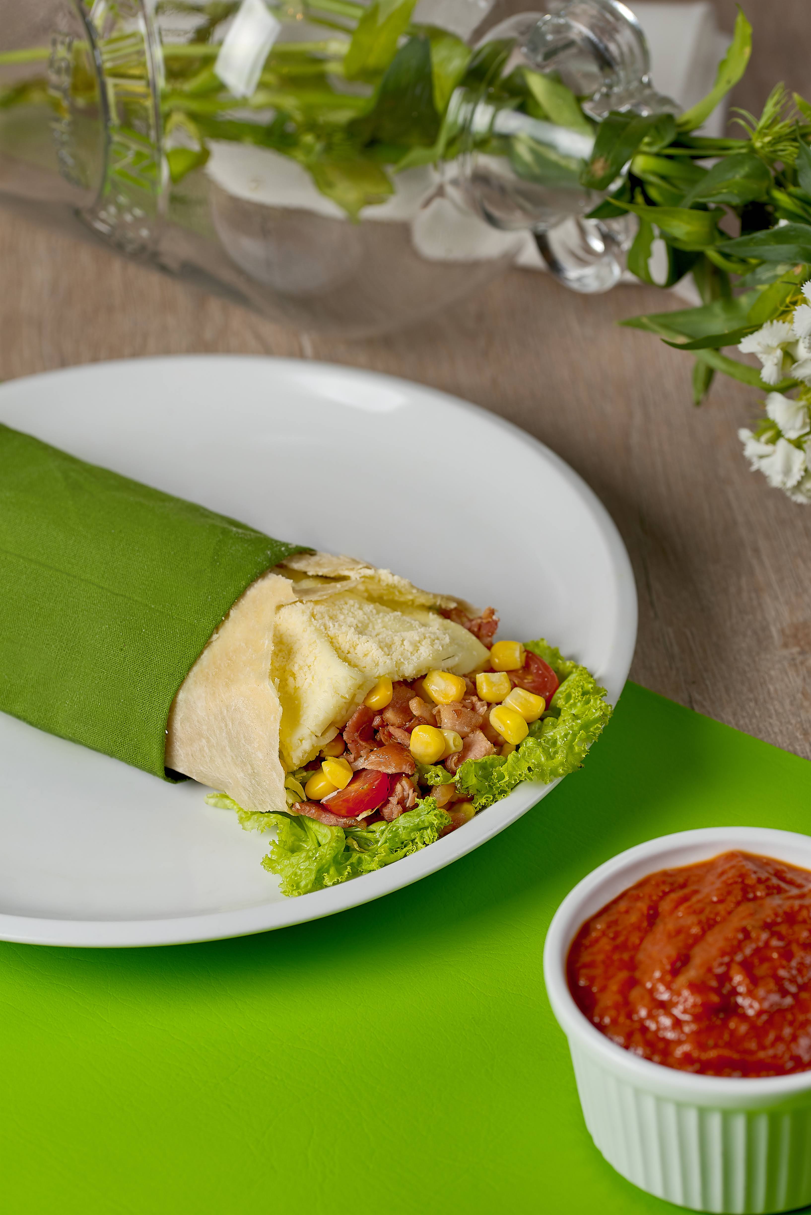 Wrap con lechuga, tomate, tocineta, maíz, queso mozzarella, queso parmesano y salsa napolitana.