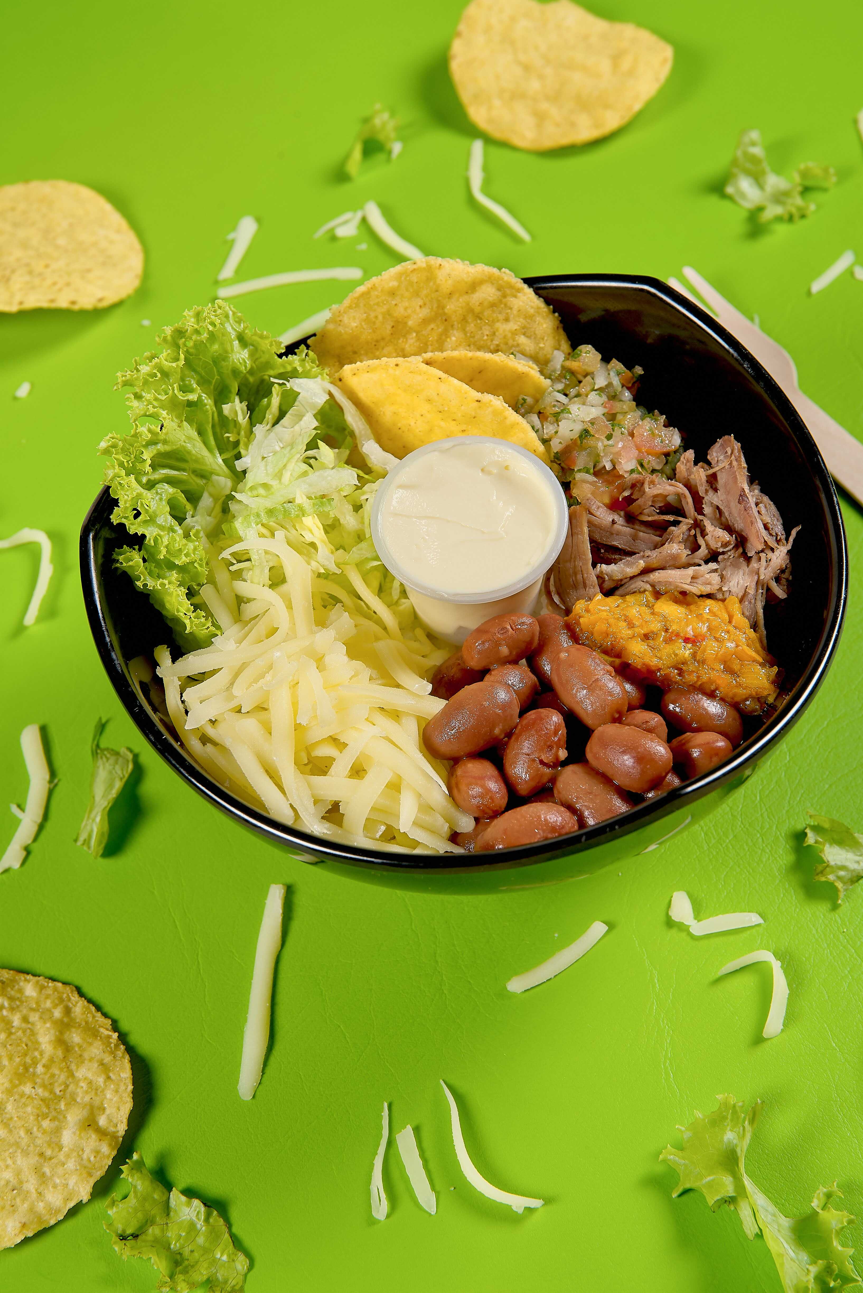 Arroz, carne, fríjol, queso, guacamole, sourcream, pico de gallo y totopos.