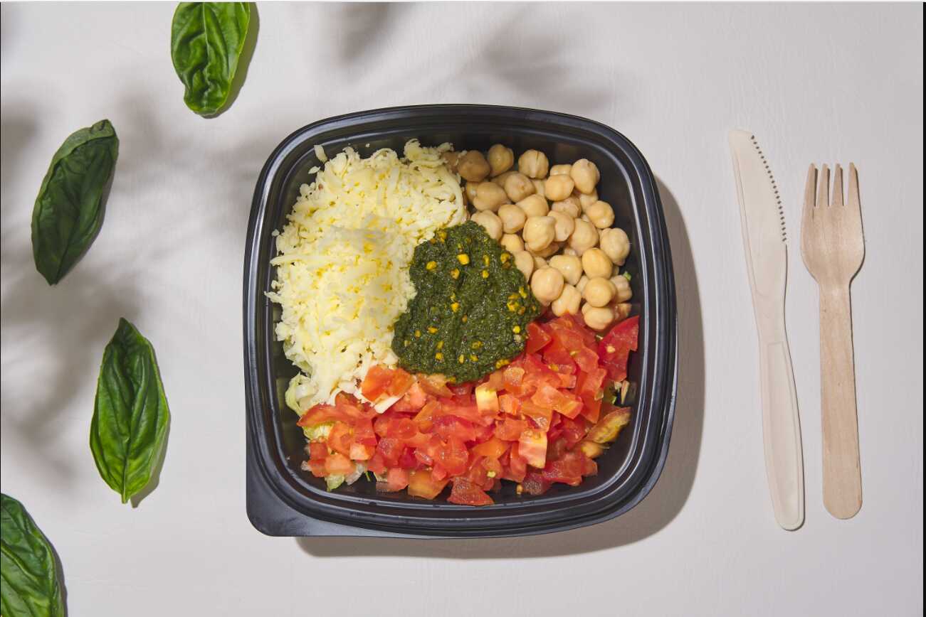 Lechuga, tomate, queso, pesto, pollo, aceite, crutones y champiñones.
