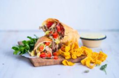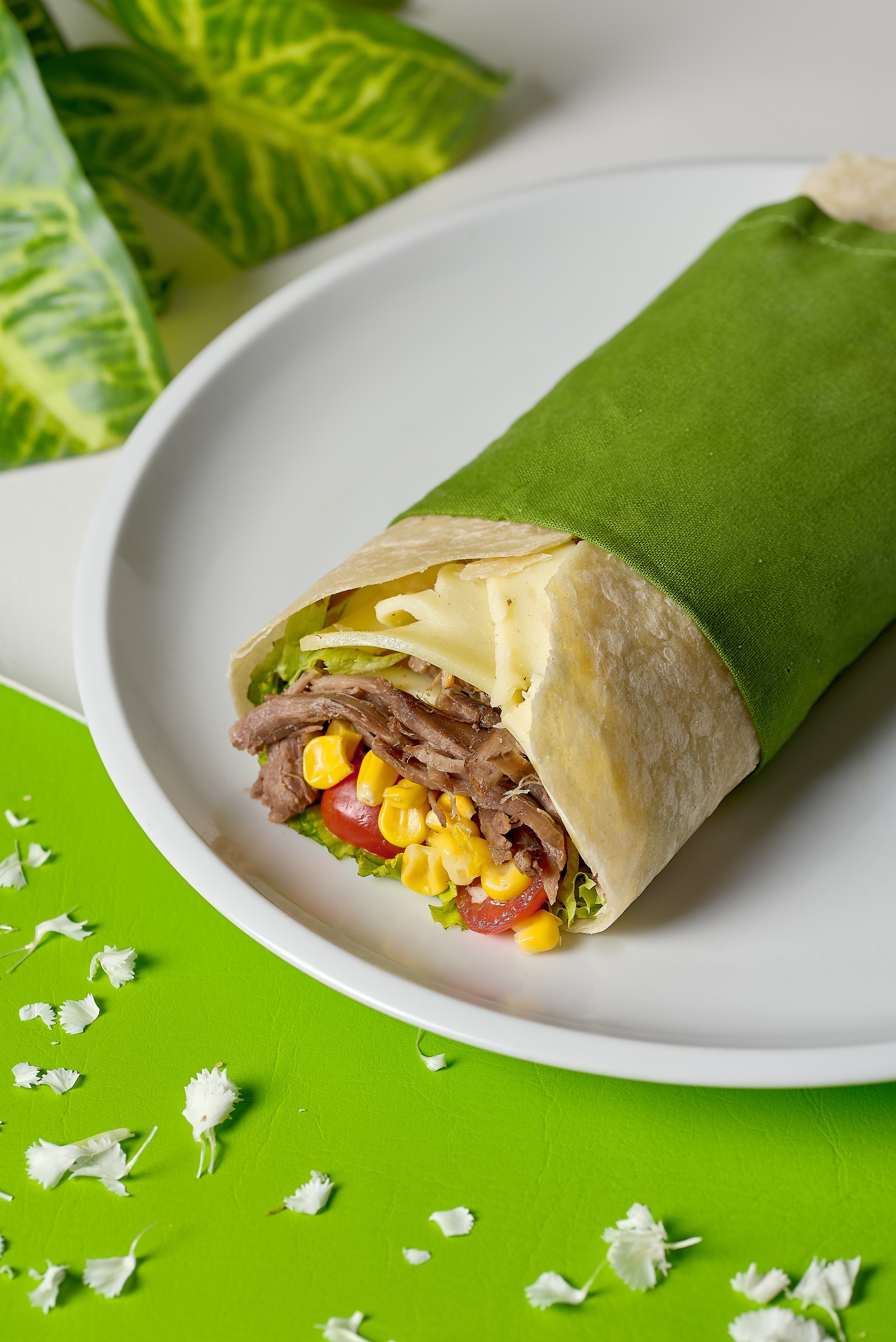 Wrap con lechuga, tomate, carne. Maíz, queso y salsa showy.