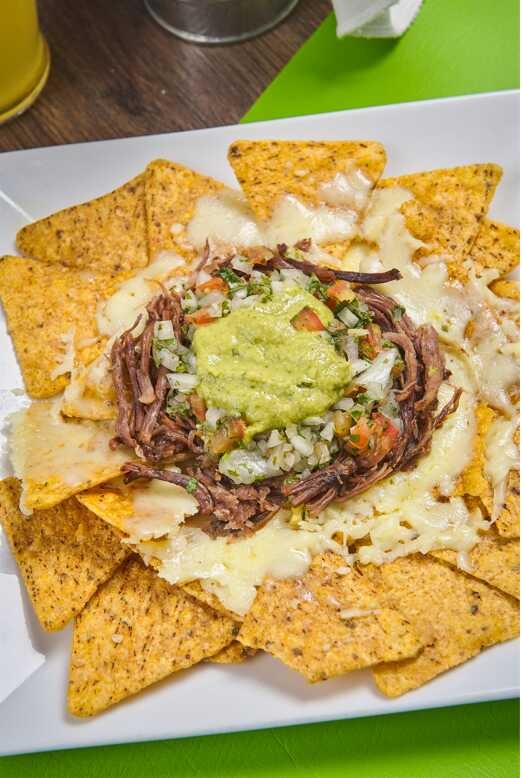 Para los carnívoros: nachos, carne, queso mozzarella, pico de gallo y guacamole.