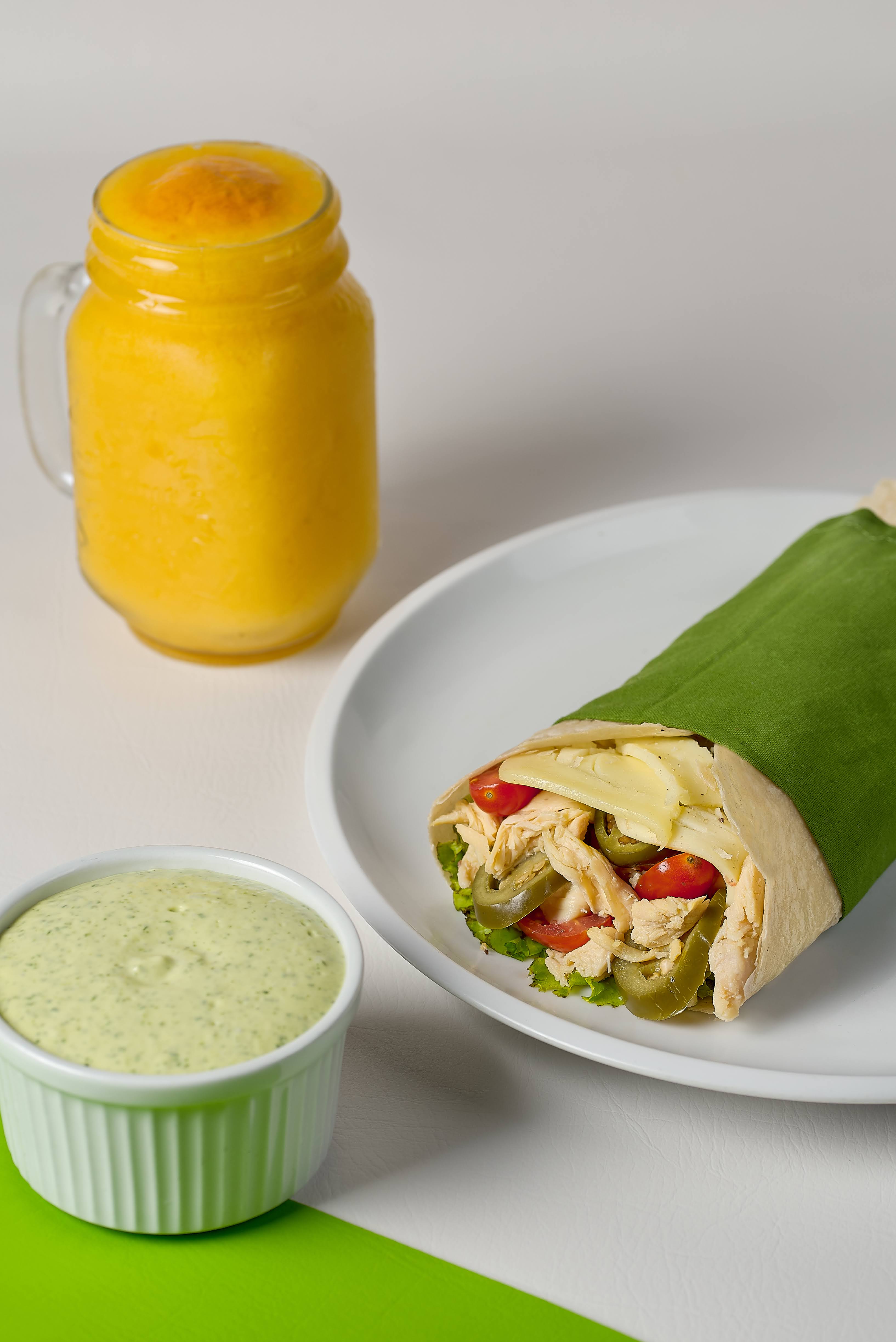 Wrap con lechuga, tomate, pollo, queso, jalapeño y guacamole.