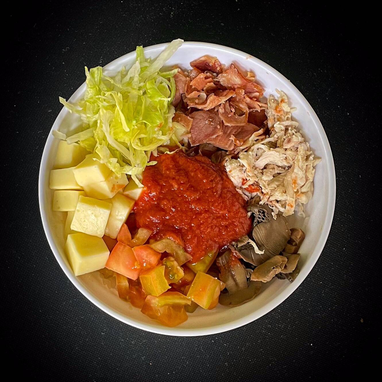 ¡Doble proteína! Pollo y tocineta con otros toppings para mezclar con exquisita salsa napolitana.