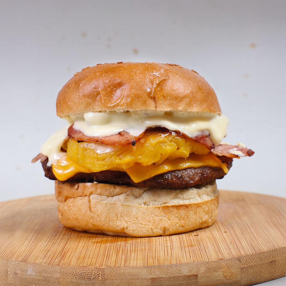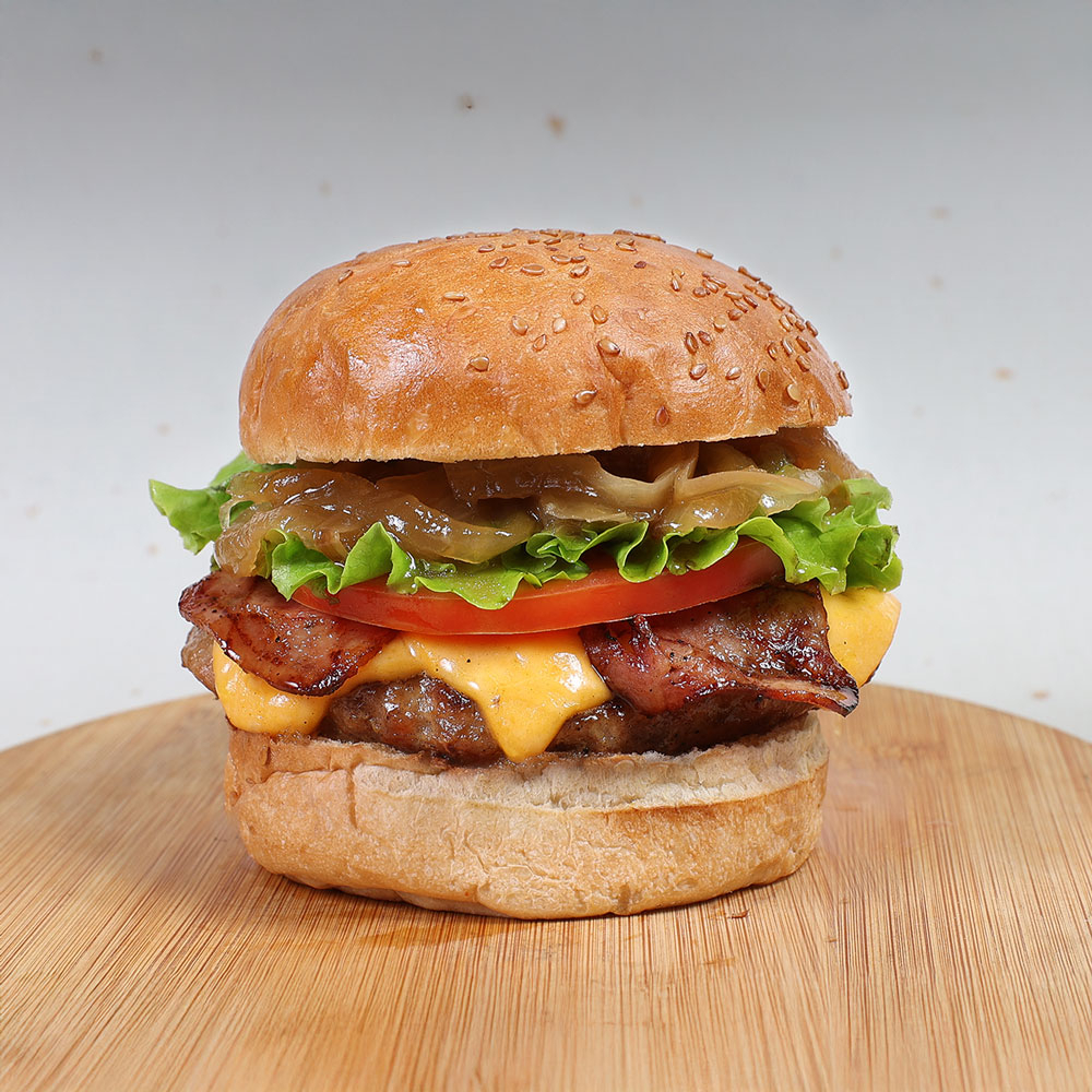 Hamburguesa 150 gramos, tocineta, cebolla grille dulce, salsa BBQ, tomate, lechuga, pan, queso tipo cheddar y salsa de tomate, mayonesa + acompañamiento + bebida