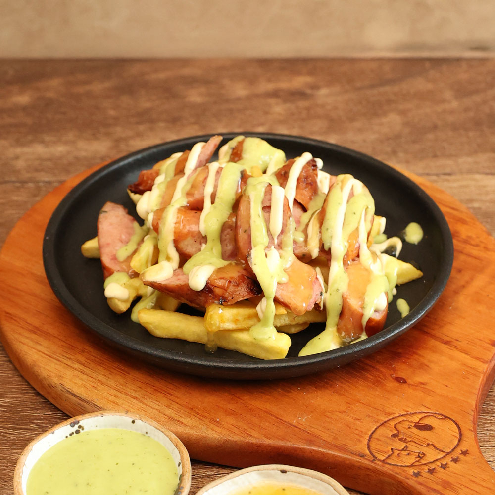 3 chorizos de la casa (cerdo o pollo) 150gr + papas a eleccion y salsas