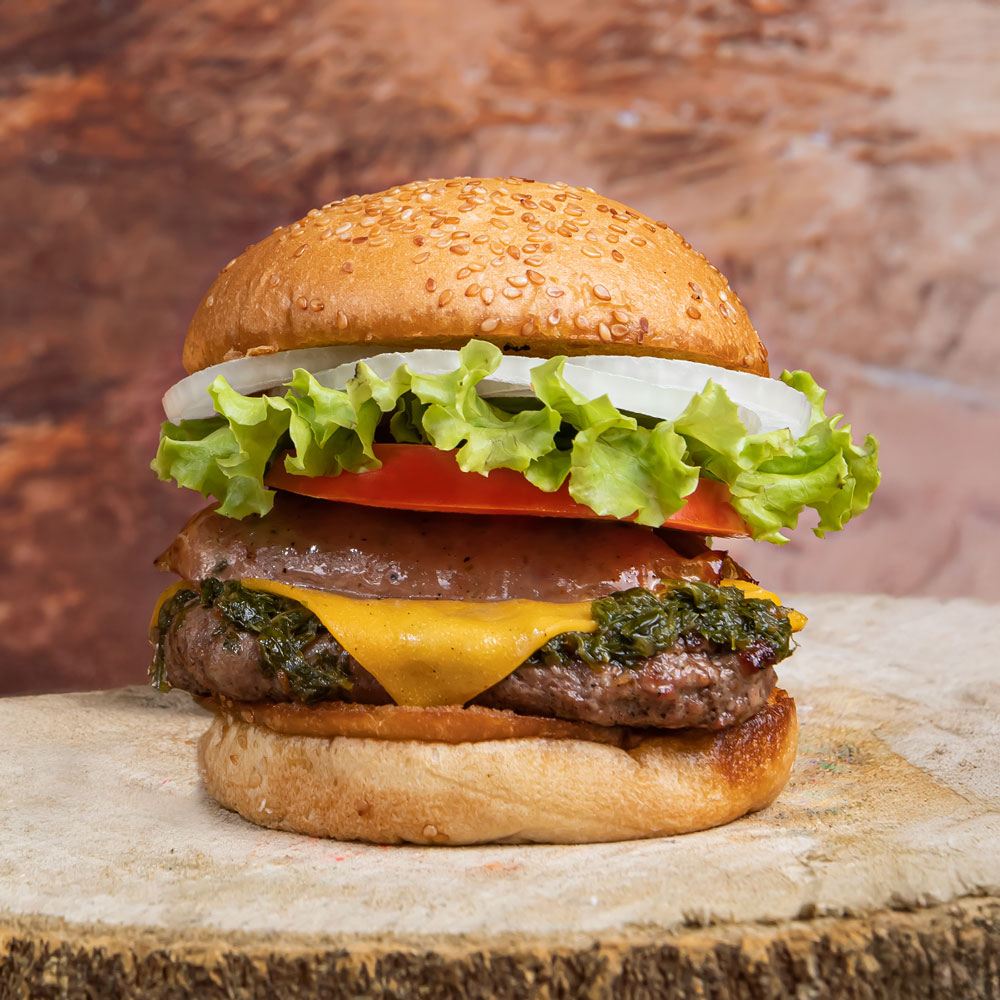 Hamburguesa 150 gramos, chorizo de la casa, chimichurri, tomate, lechuga, cebolla, pan artesanal, queso tipo cheddar y salsa de tomate, mayonesa y bbq