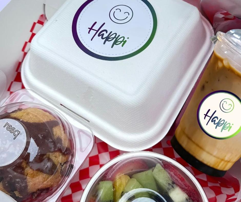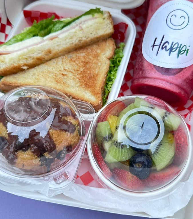 Caja decorada y personalizada con: 1 Sandwich, 1 granizado mediano Happi Splash o el de su preferencia, 1 porcion de fruta o mix, 1 muffin o galleta de red velvet.