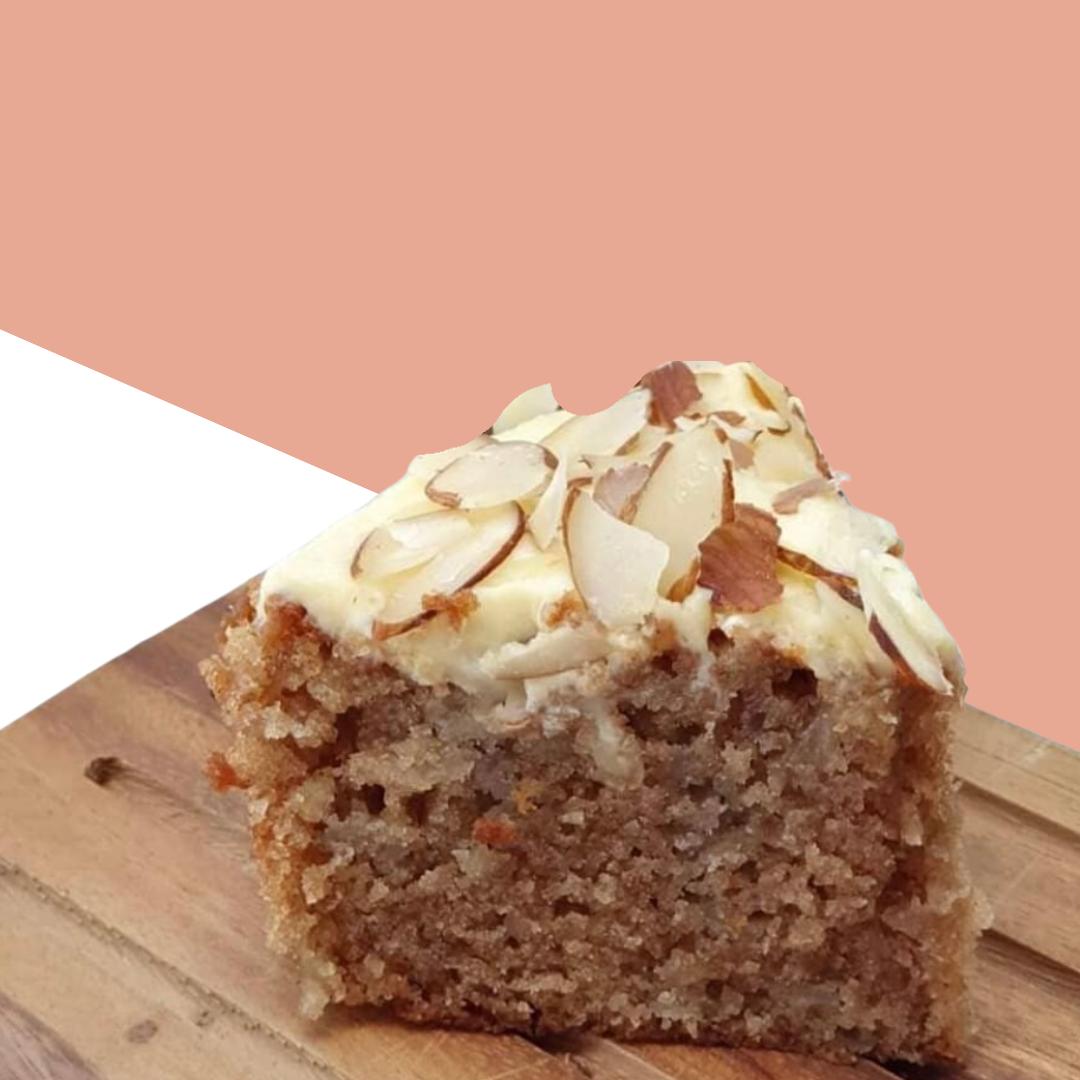 Torta de manzana, con cubierta de frosting de queso y laminas de almendras.