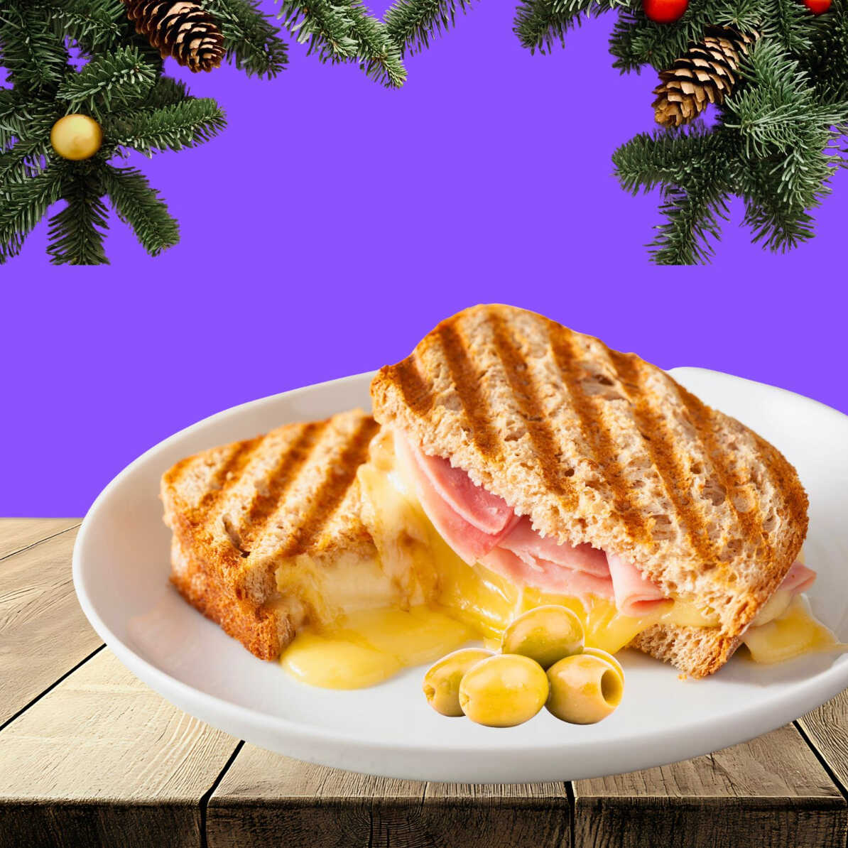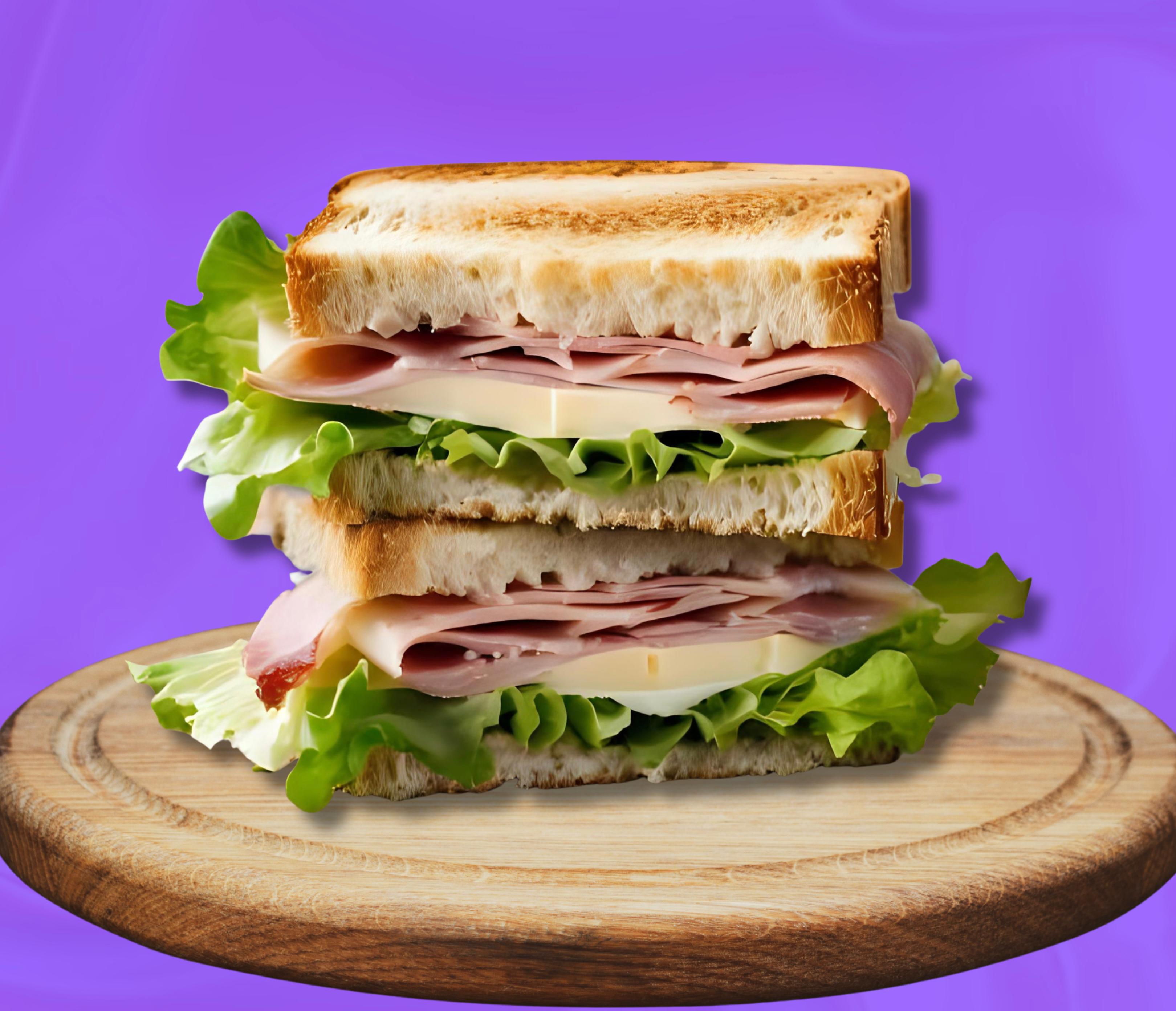 Delicioso sandwich en pan artesanal o multicereal, queso, jamón y aceitunas.