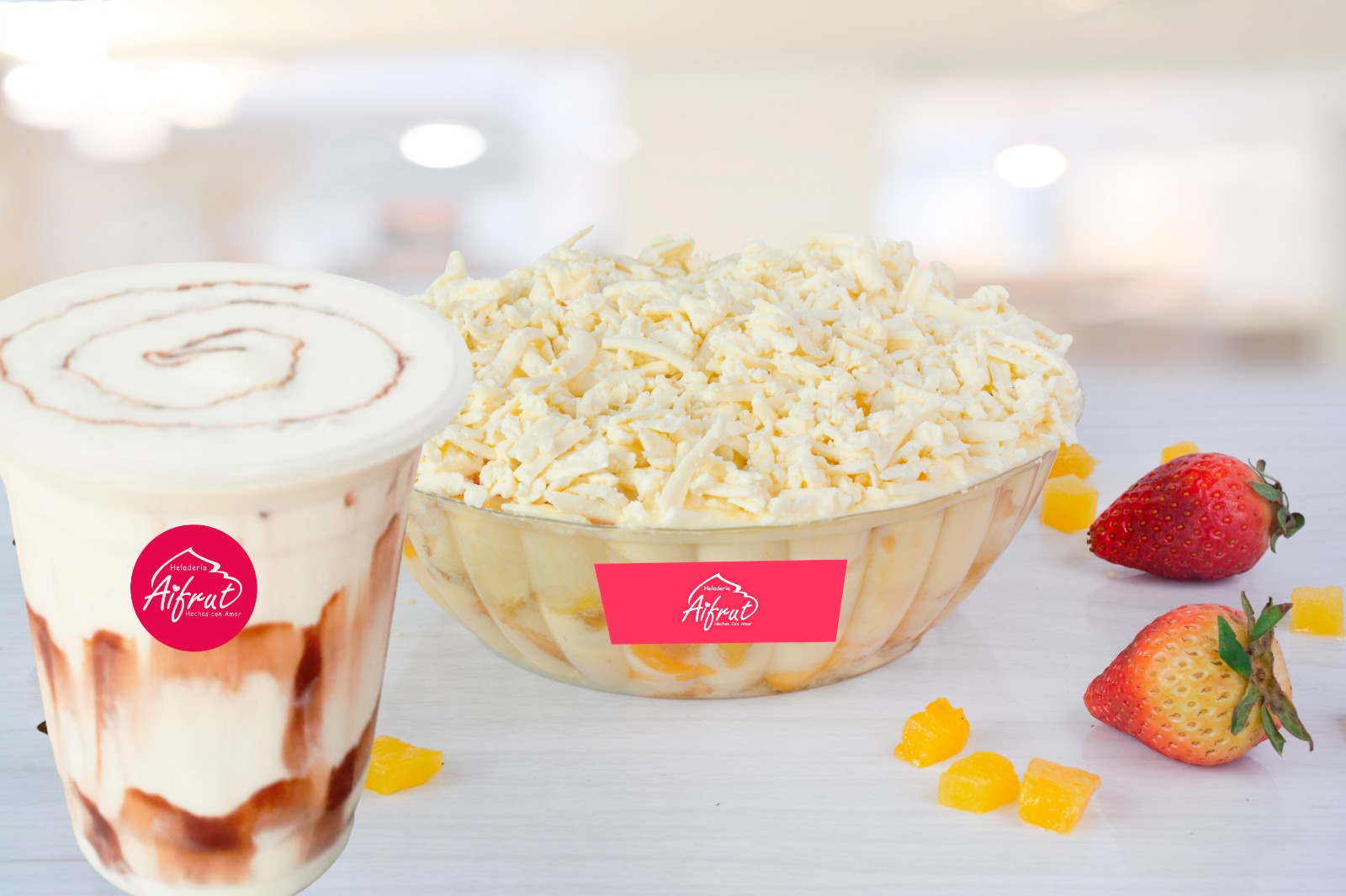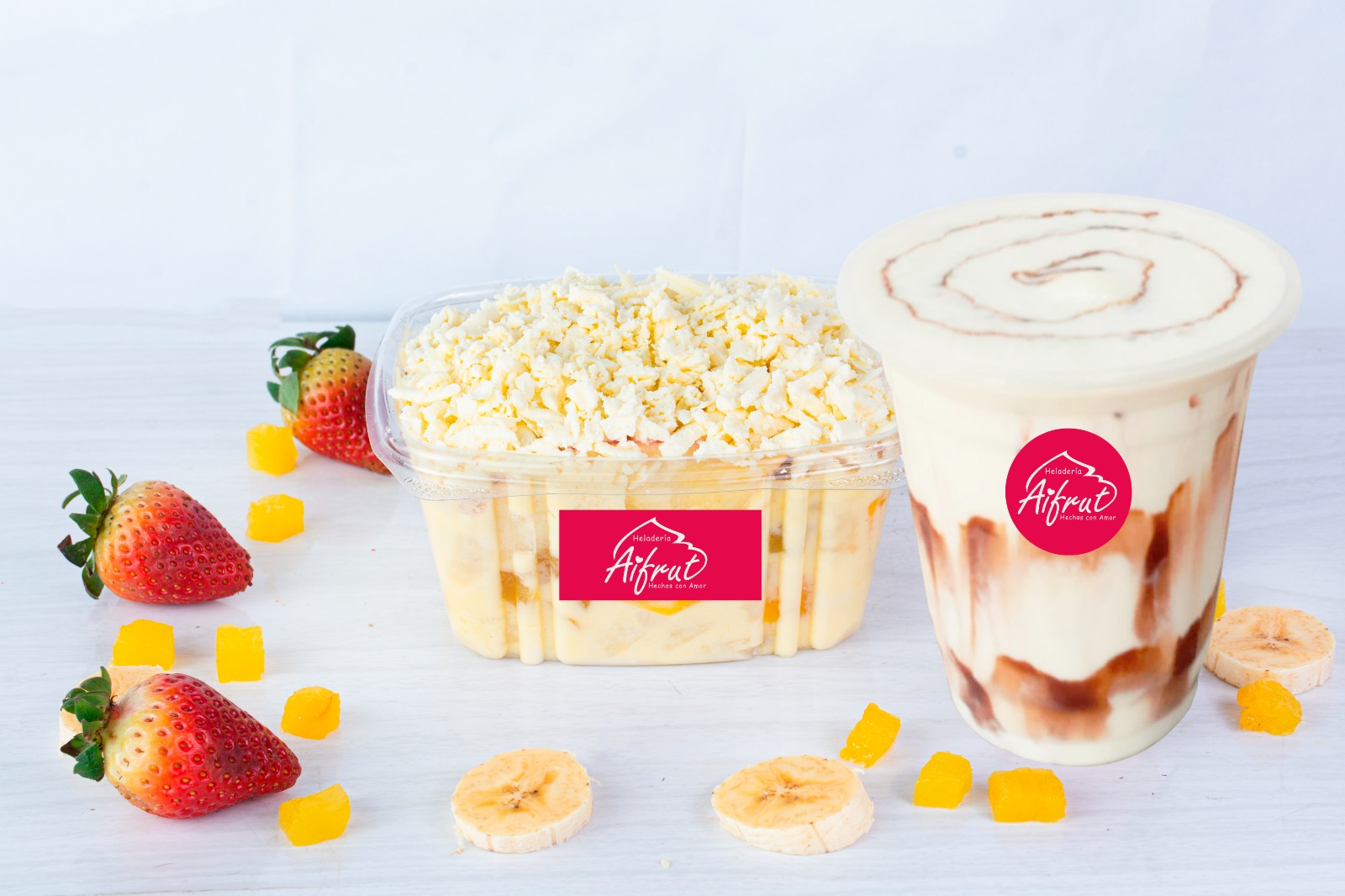 Deliciosa y cremosa ensalada de frutas (Banano, piña, fresa y mango) con queso acompaña de un rico tarro de helado (medio litro)