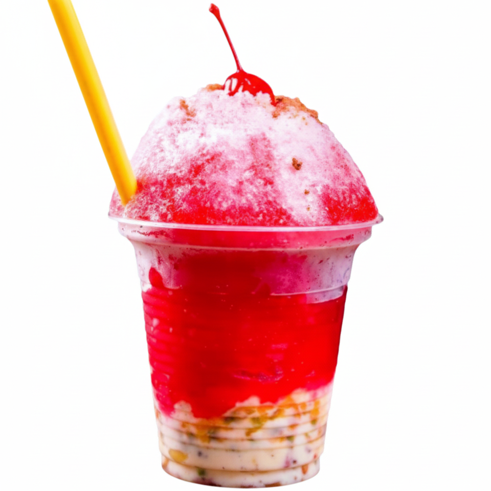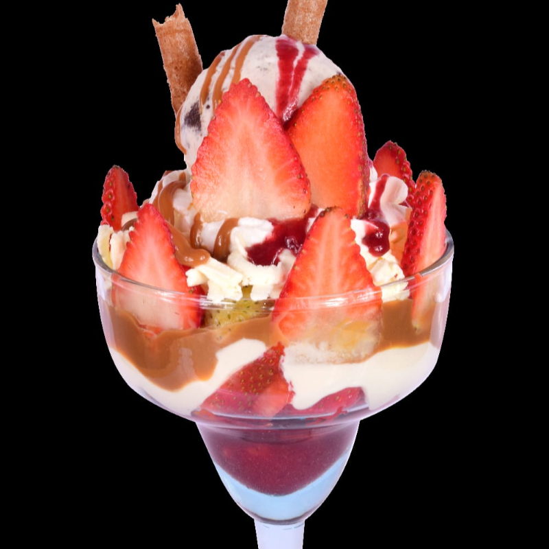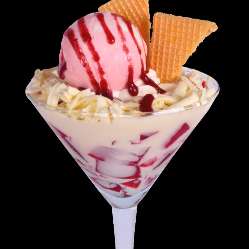 Vaso de 12onzas, 1 bola de helado a elección, gelatina en trozos, crema de la casa, salsa de fresa, galleta.