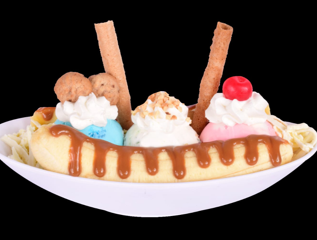 Acompañado de deliciosas 2 bolas de helado a elección, banano, salsa de chocolate, fresa, mora, lechera, barquillo, lluvia de colores, maní.