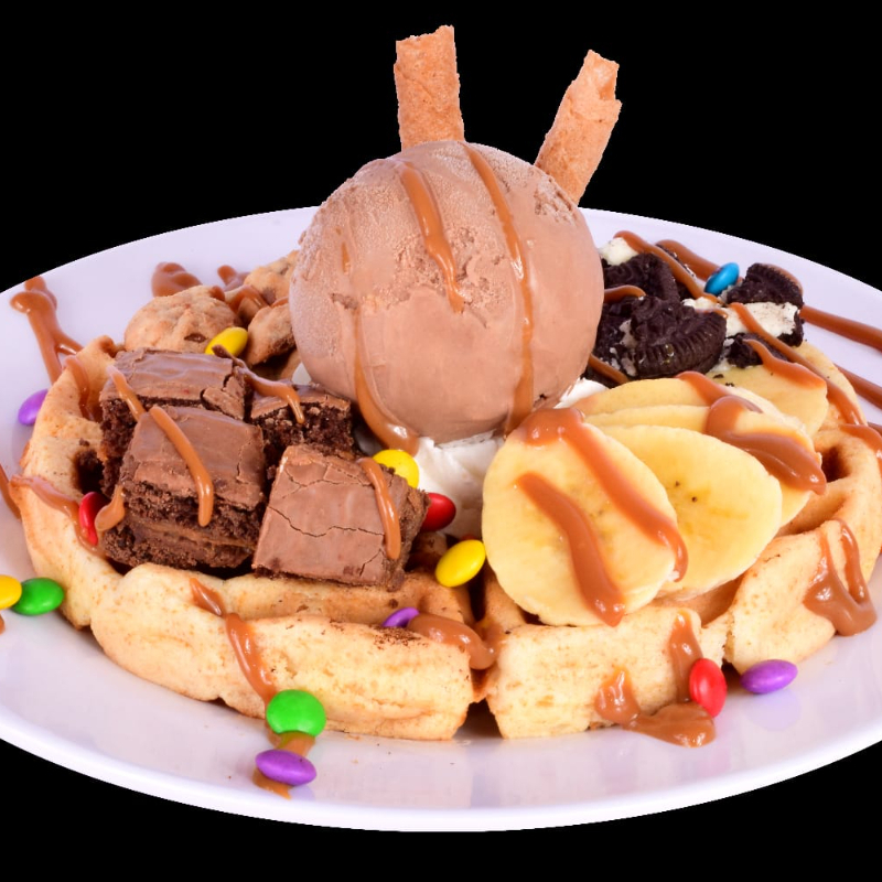 Delicioso waffle acompañado de fresas, mango, manzana, pera, queso, rodajas de banano, 2 bolas de helado a elección.