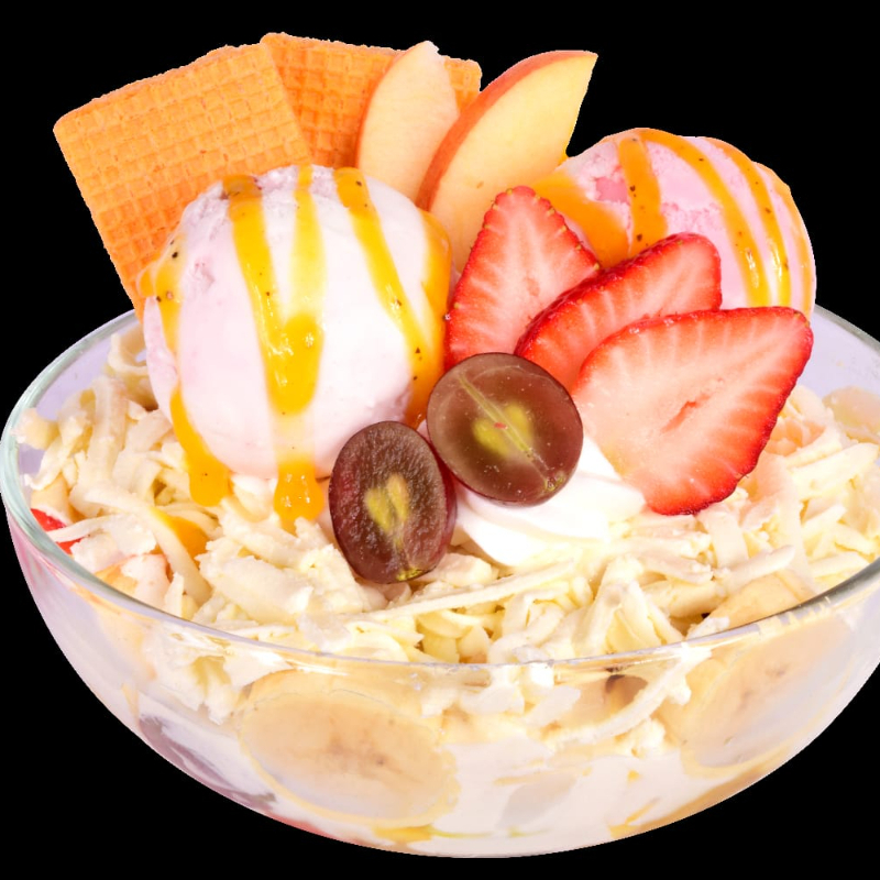 Deliciosa ensalada de frutas acompañado de piña, melado de mango, pero, manzana, banana, fresa, uvas, queso, galletas, 2 bola de helado a elección.