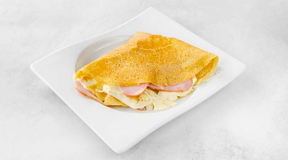 Crepe con mozarrella, salsa dijonnaise y chucrut de cebolla.
