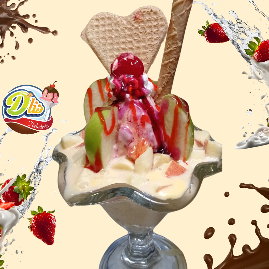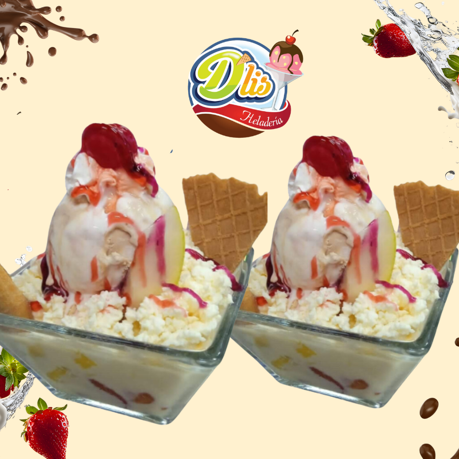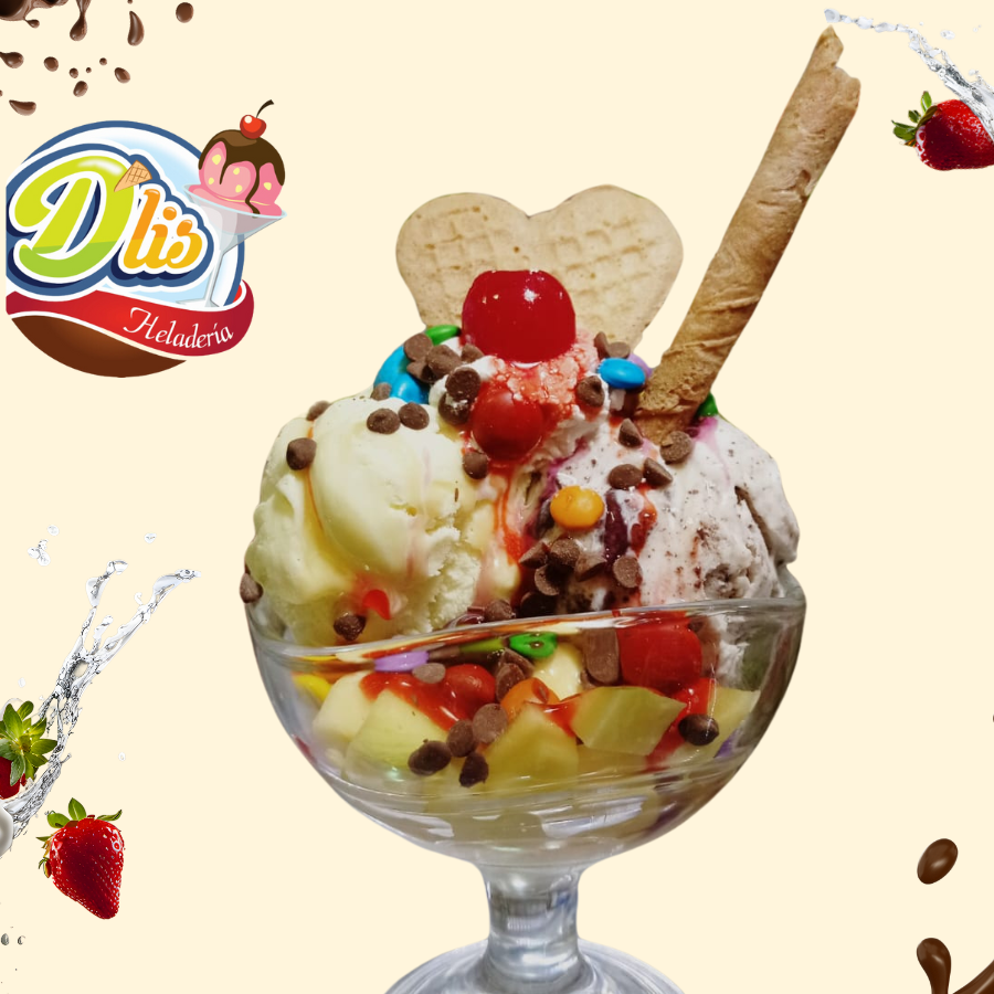 3 sabores de helado, 3 topping a elección elige frutas, queso, dulces, crema de leche o perlas explosivas de nuestra lista de toppings, salsas y galletas