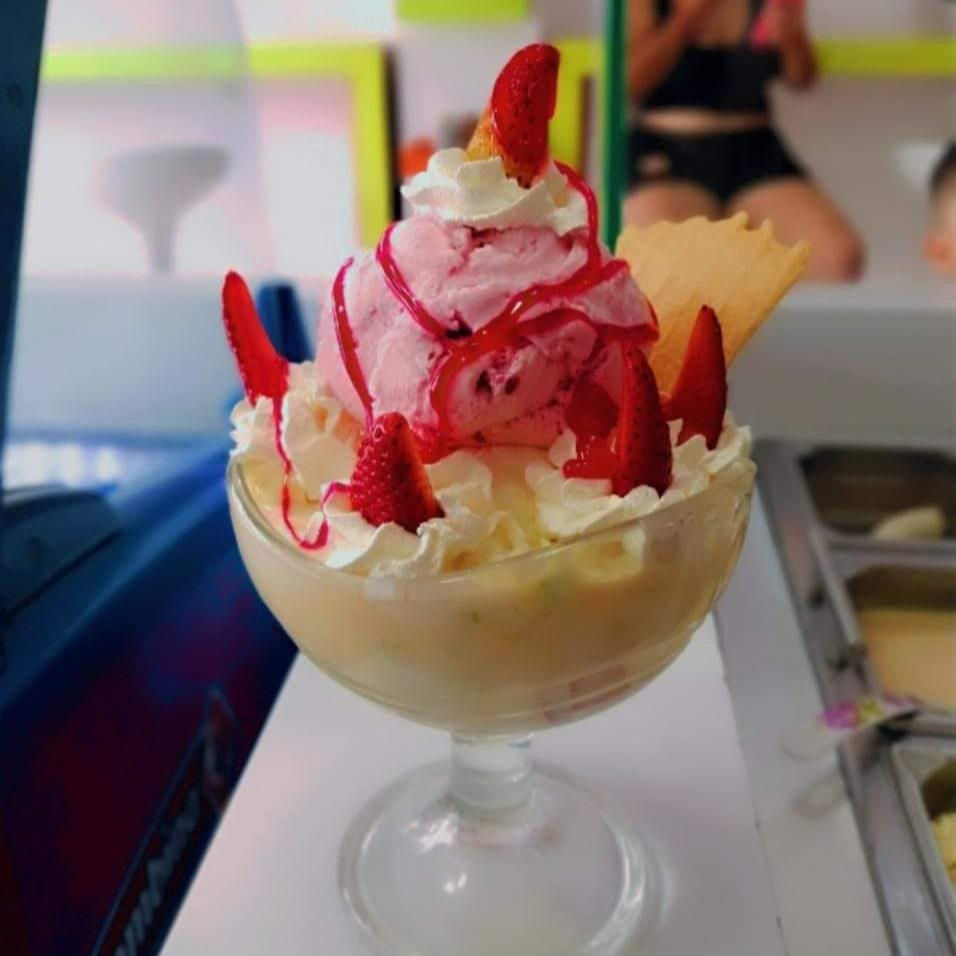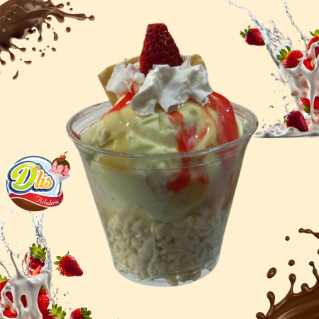 Contiene 3 sabores de helado, queso rayado, coco y maní triturado, galleta y salsa