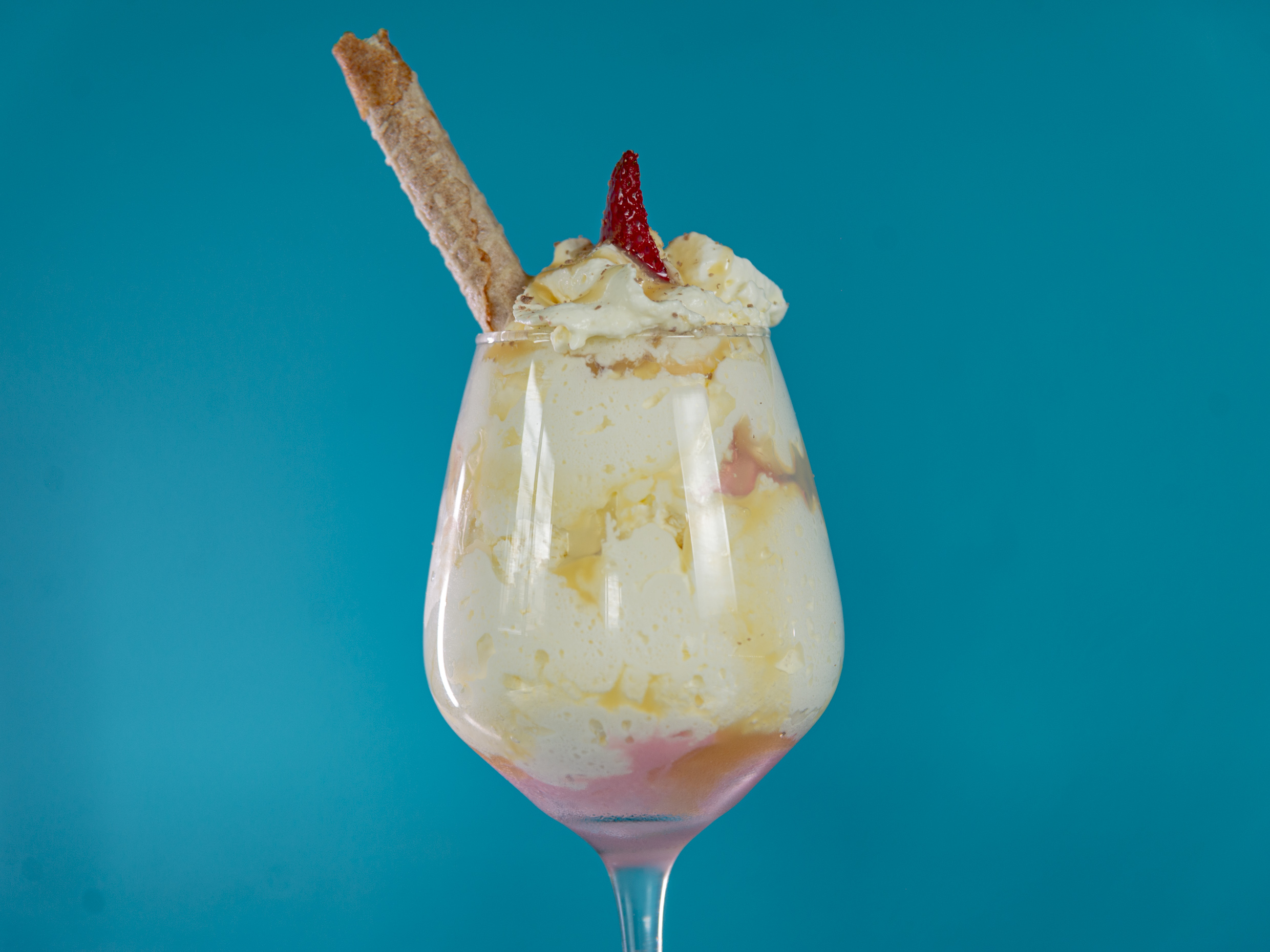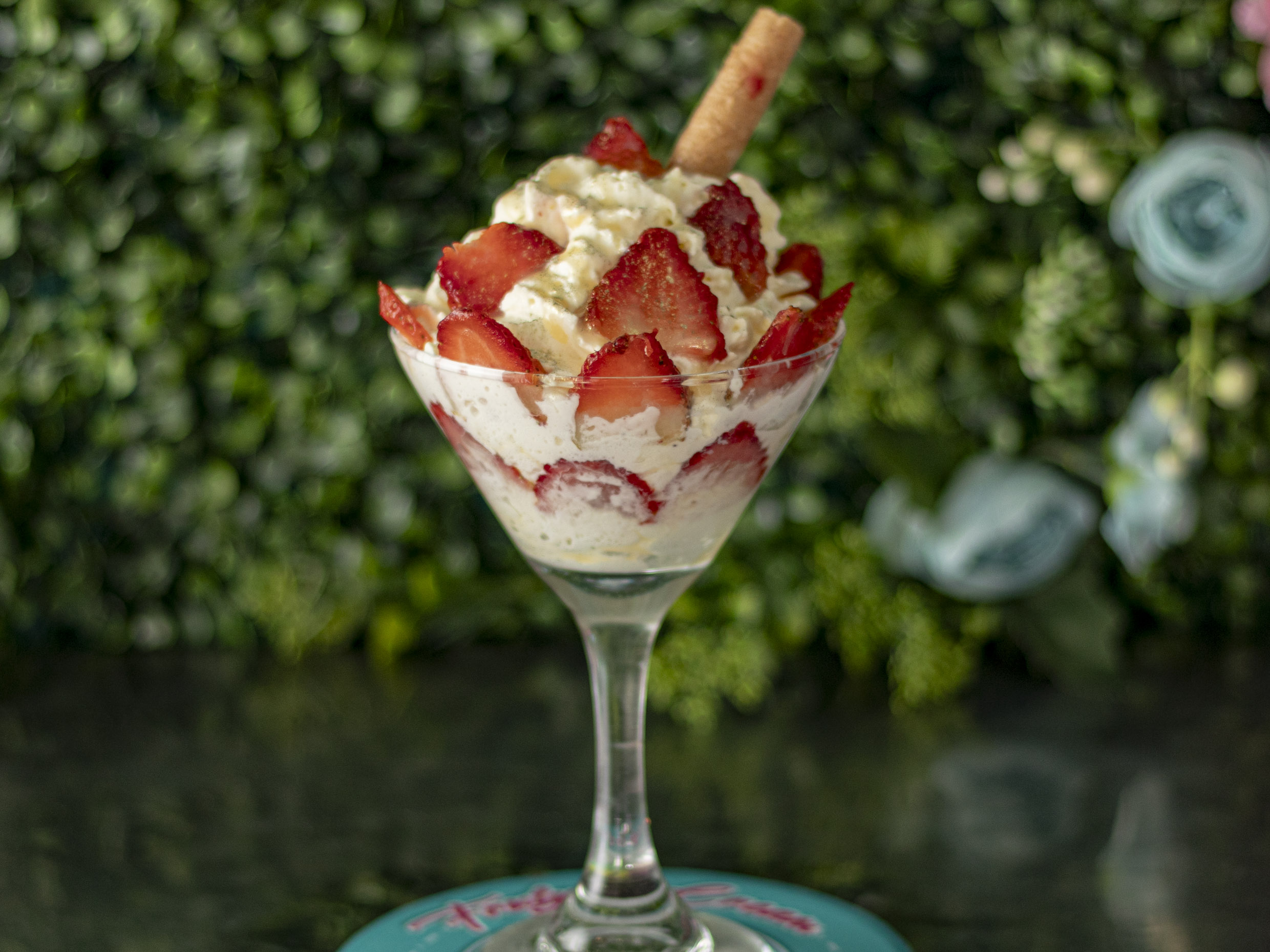 2 Bolas de helado acompañado de fresas, salsa de arequipe y crema chantillí.