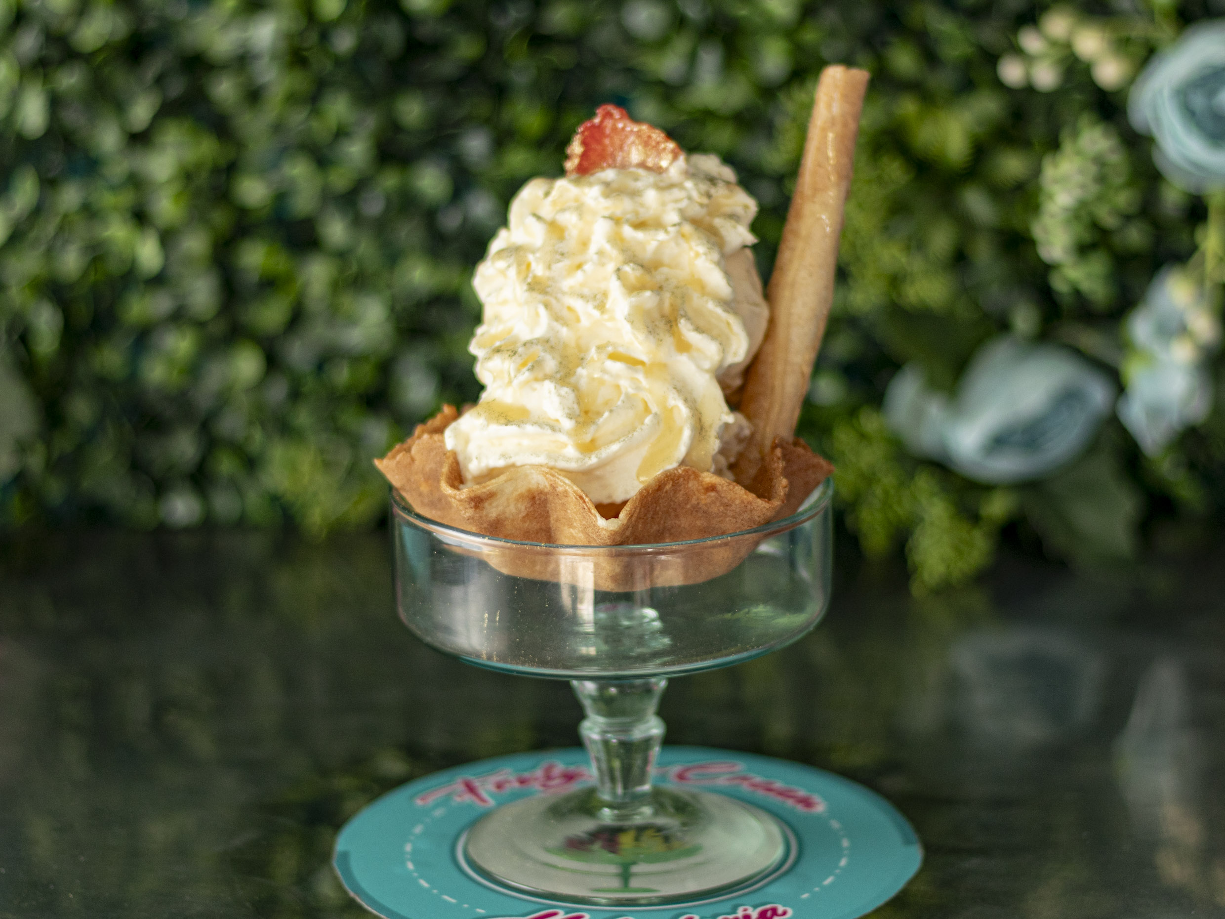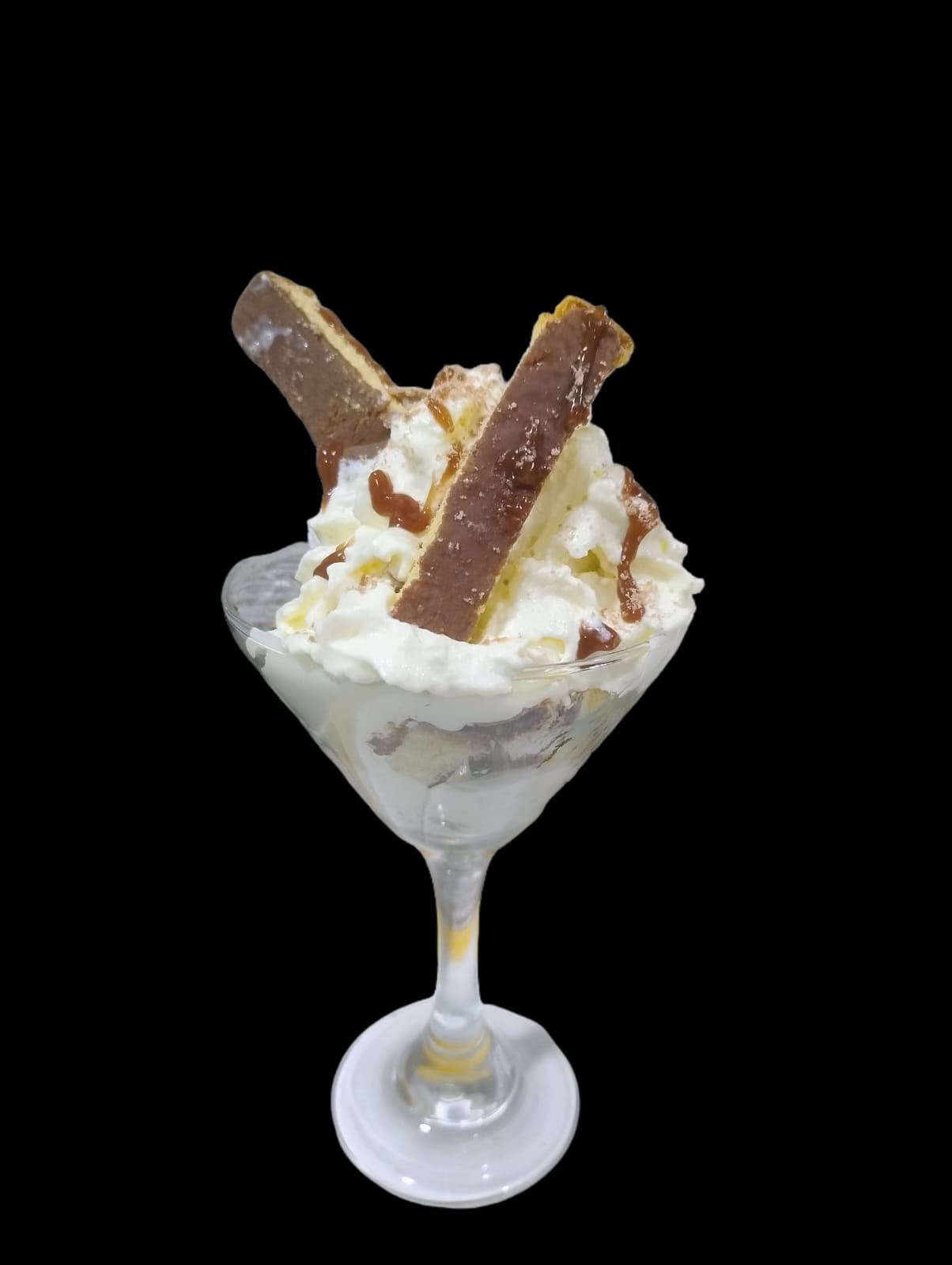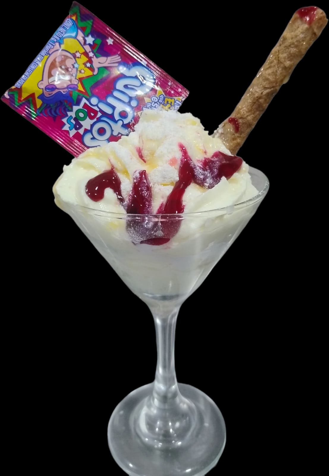 2 Bolas de helado, acompañado de Quipitos, crema chantillí y leche condensada.