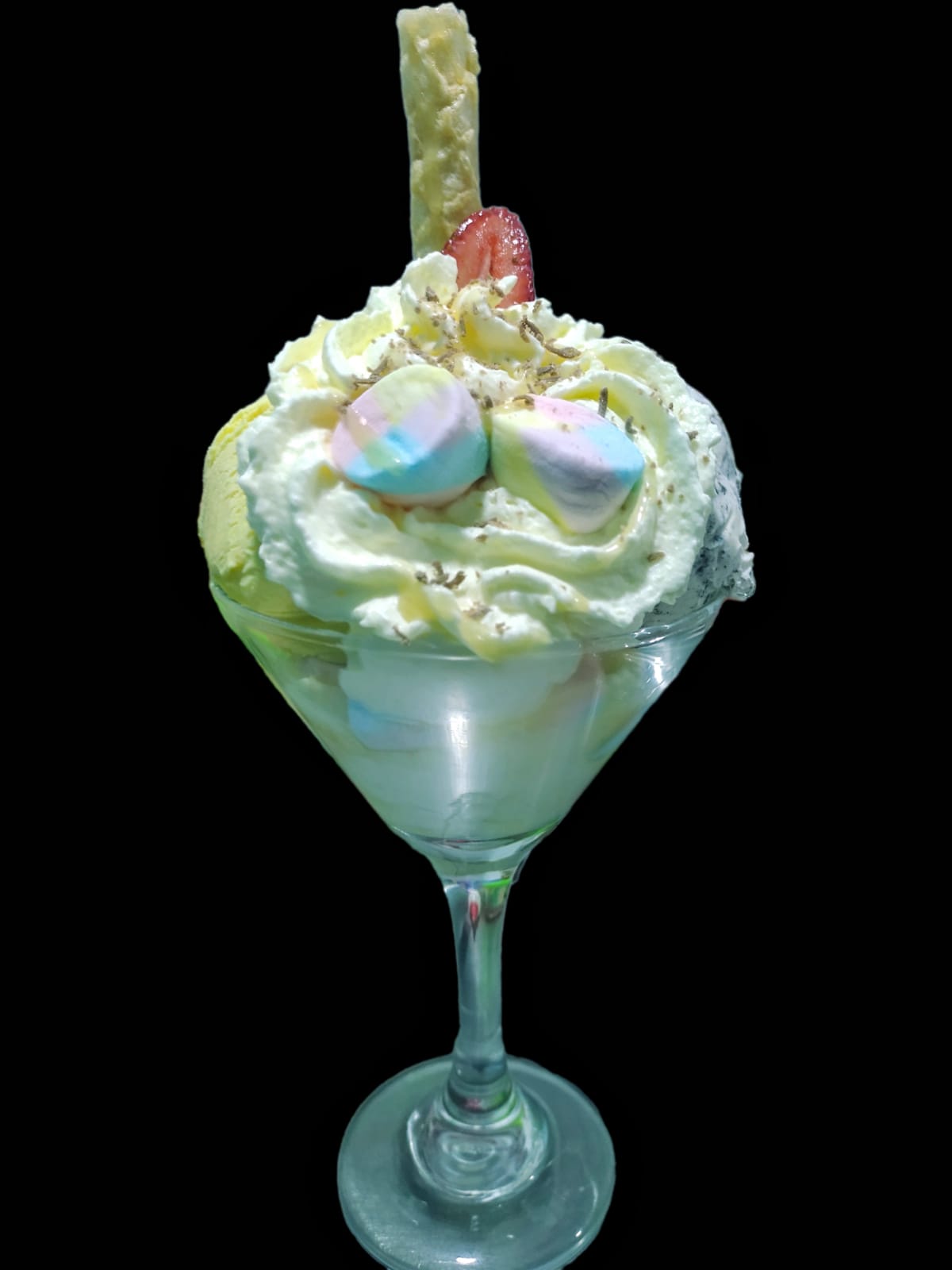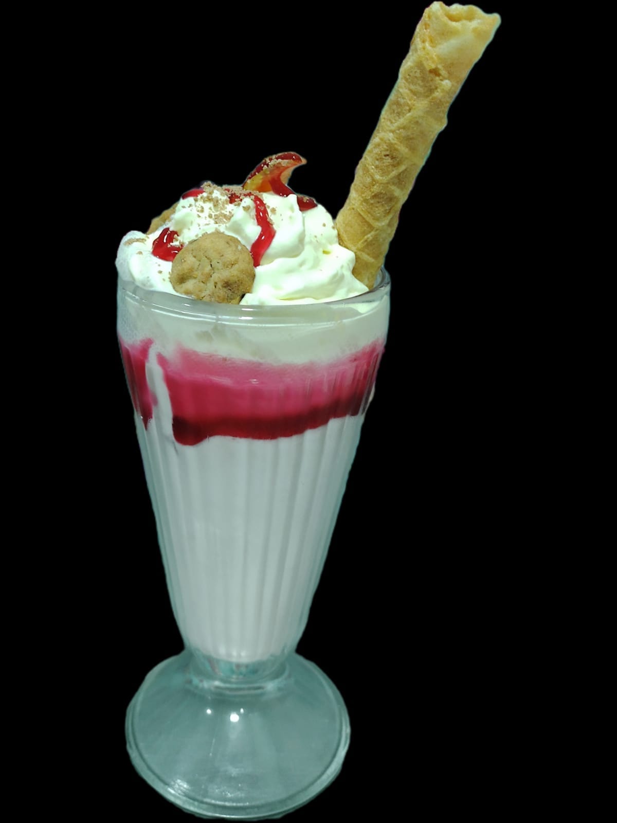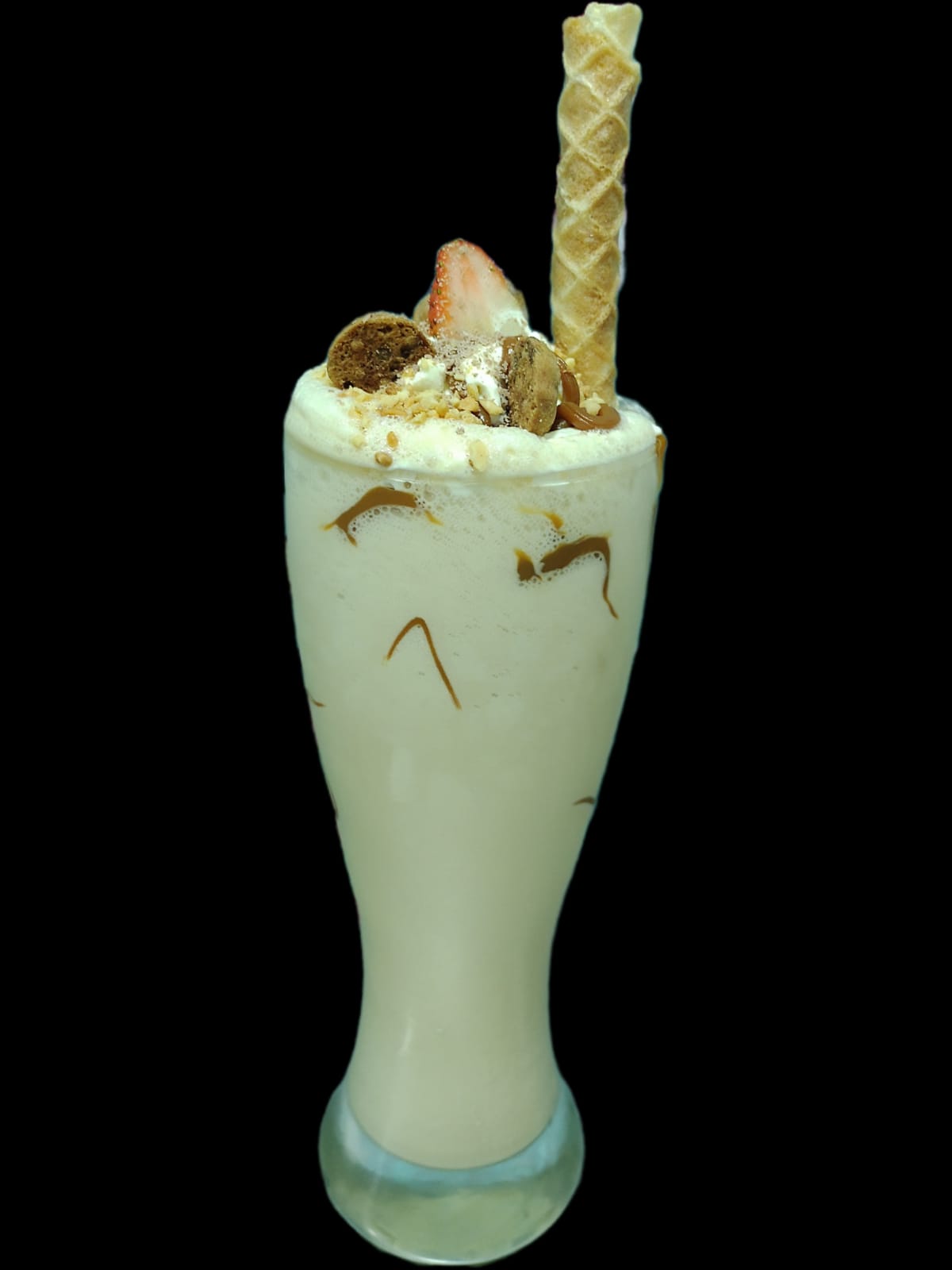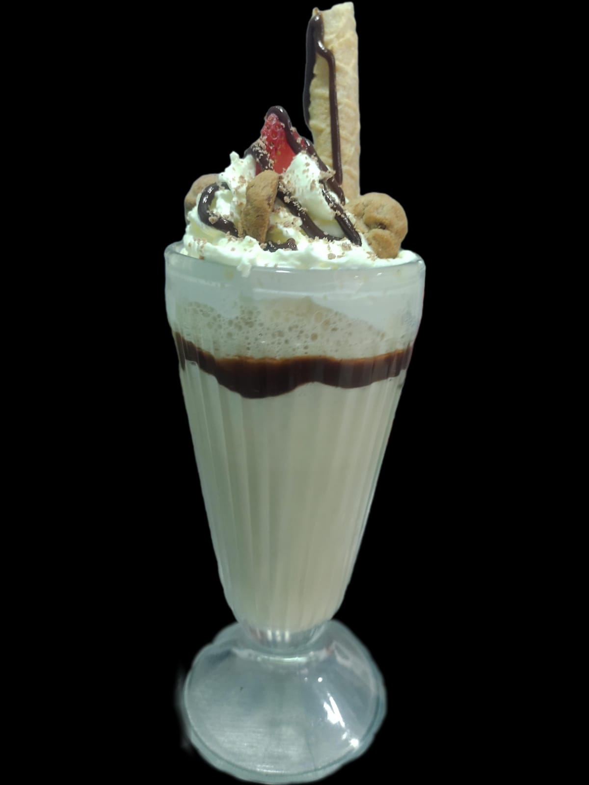 Delicioso batido del sabor de helado que prefieras, acompañado de crema chantillí y salsa.