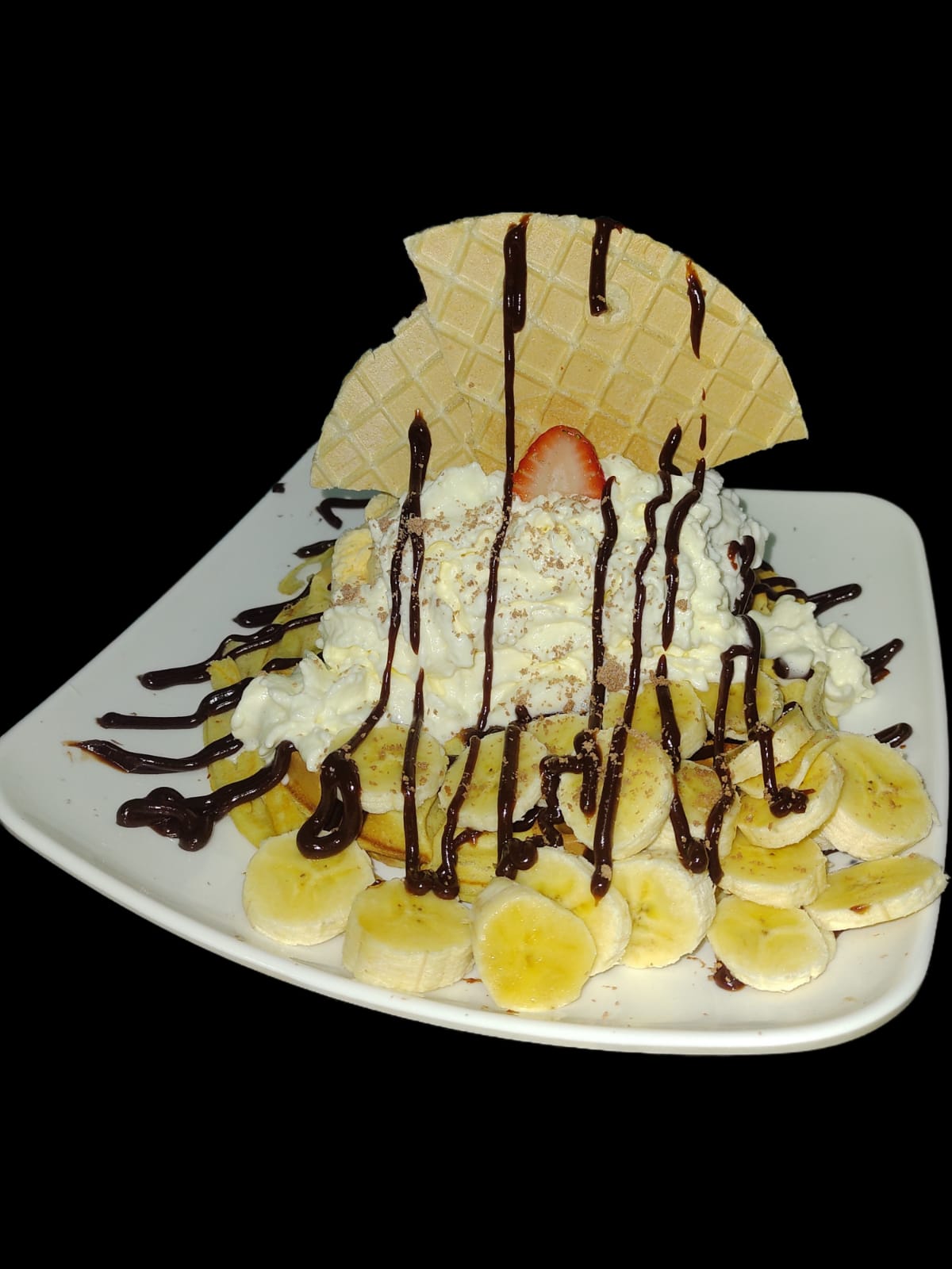 2 Bolas de helado acompañado de banano, salsa de chocolate y crema chantillí.