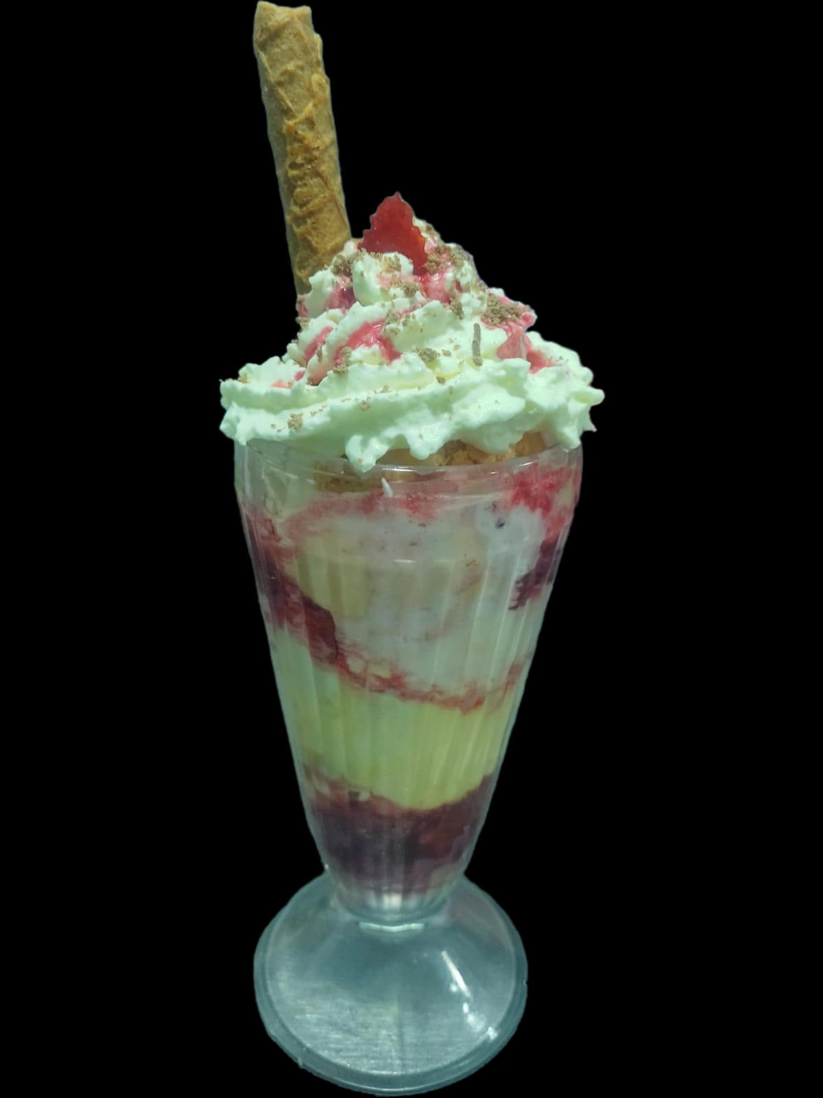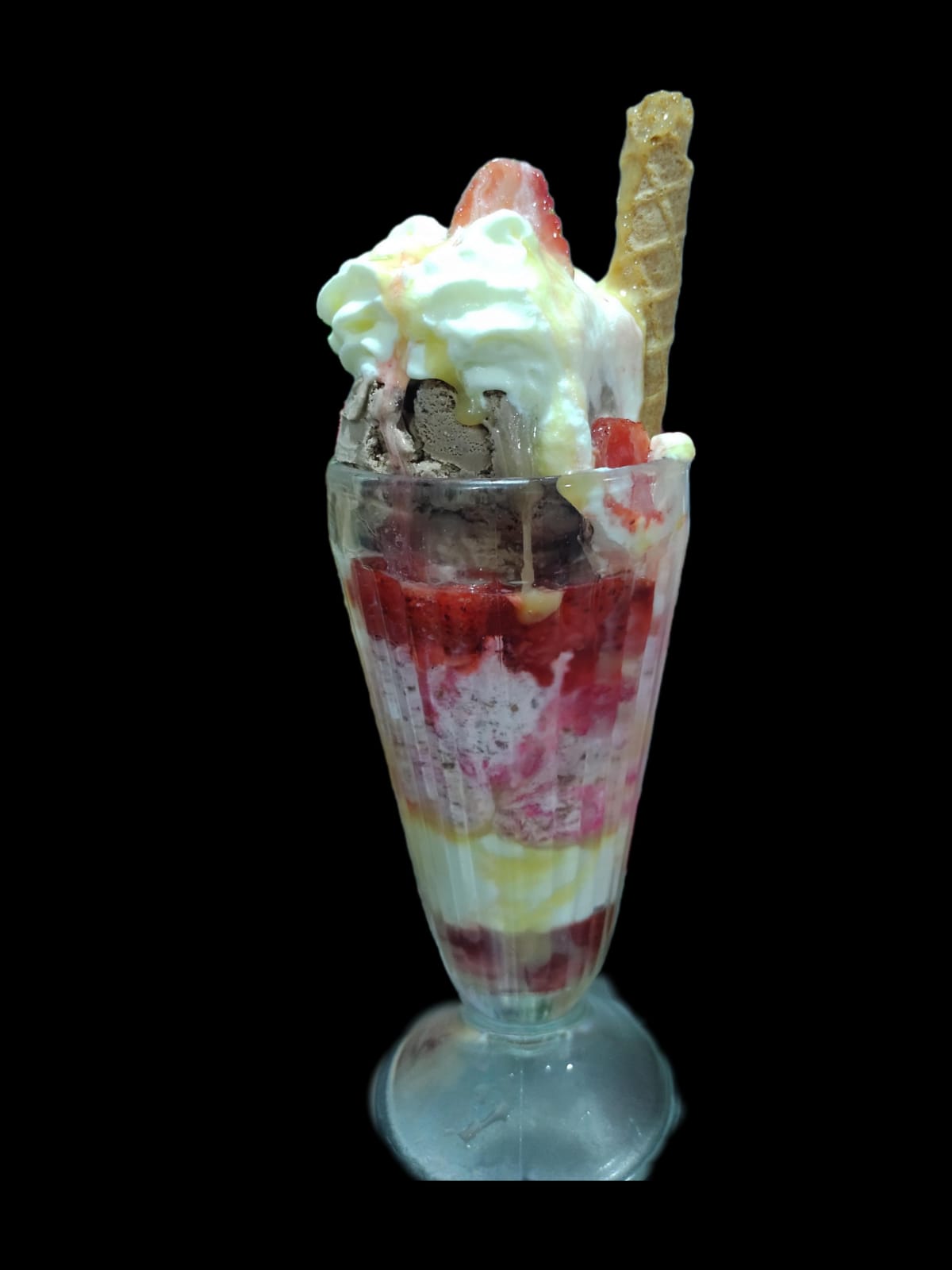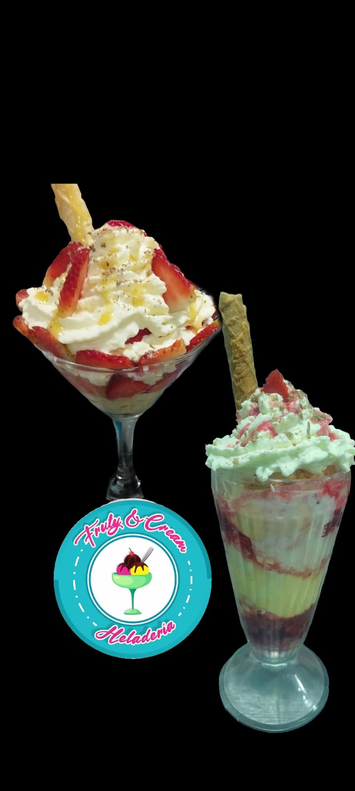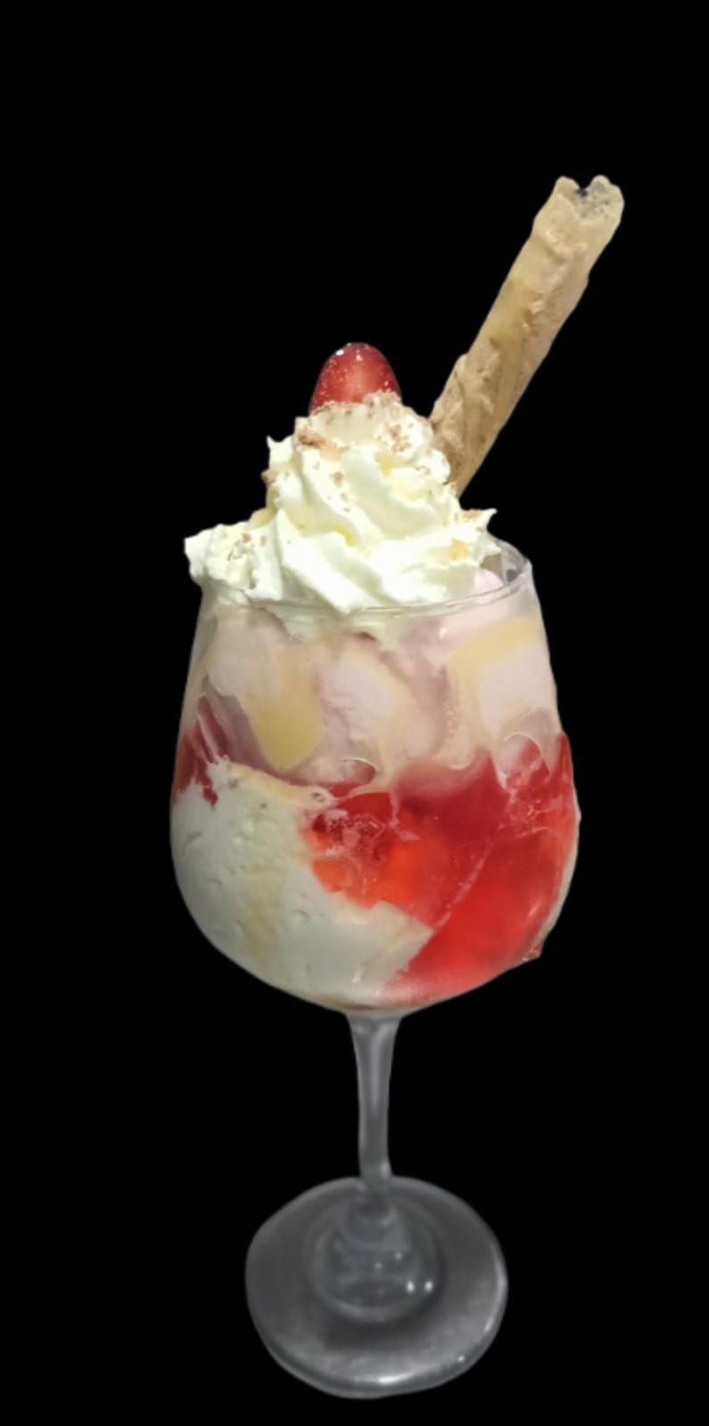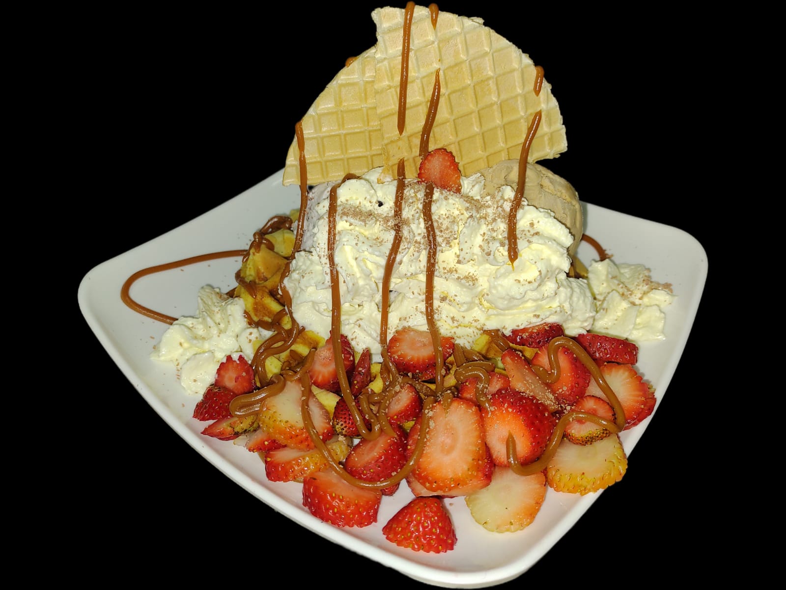 2 Bolas de helado acompañado de banano, fresas, delicioso queso, crema chantillí y leche condensada.