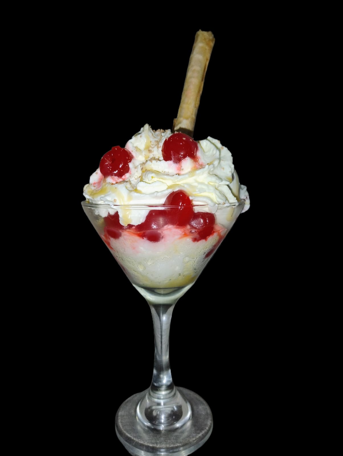2 Bolas de helado, acompañado de cerezas, crema chantillí y leche condensada.