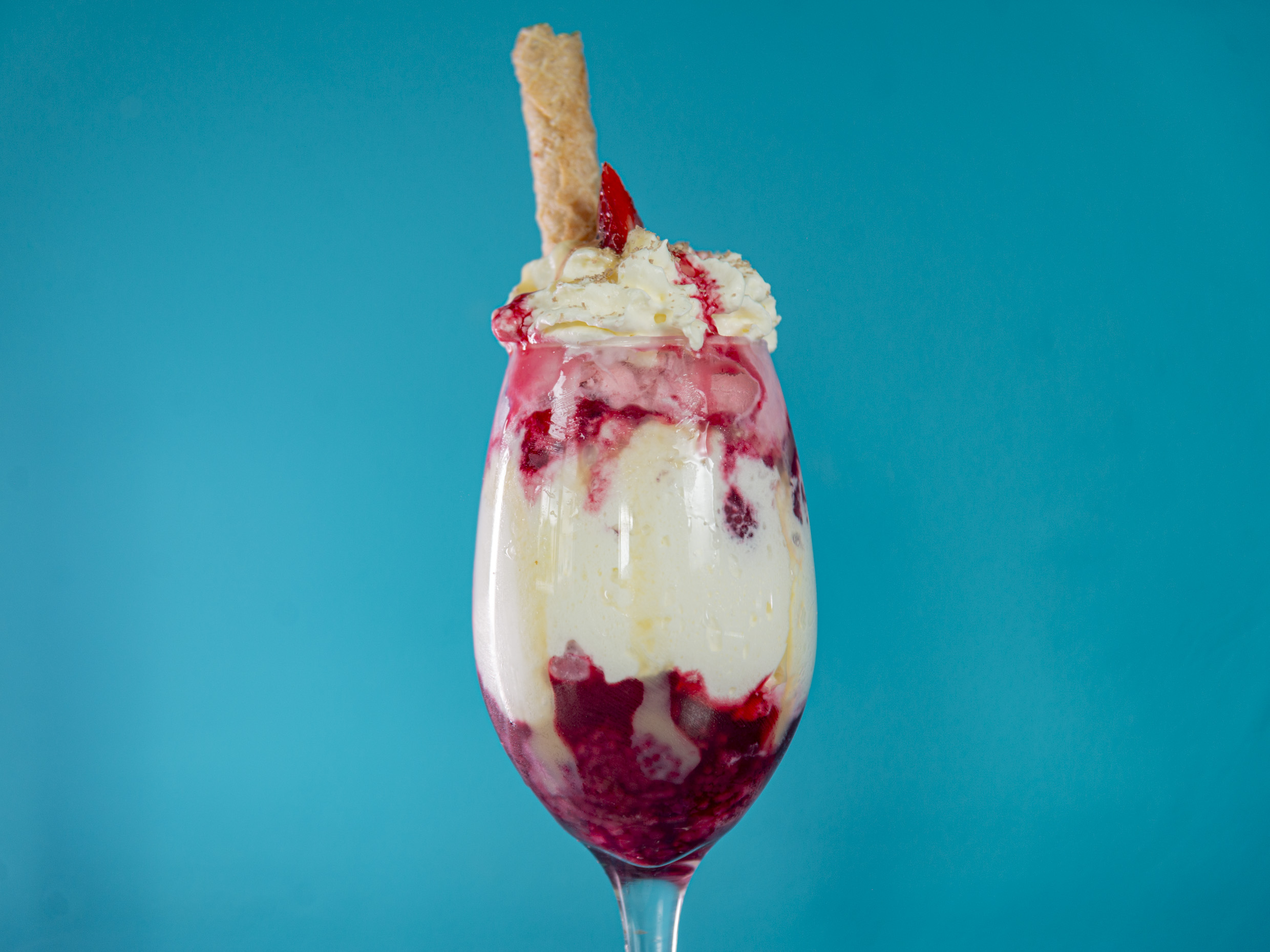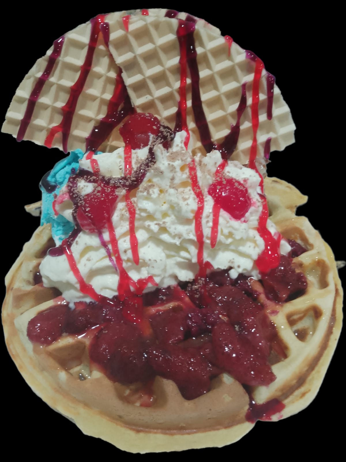 2 Bolas de helado acompañado de almíbar de fresa y almíbar de mora, cereza, crema chantillí y salsas.