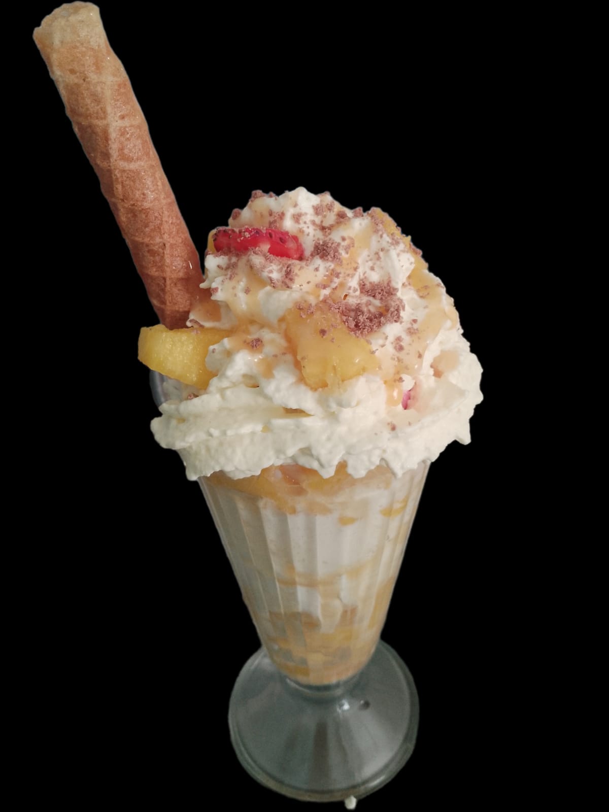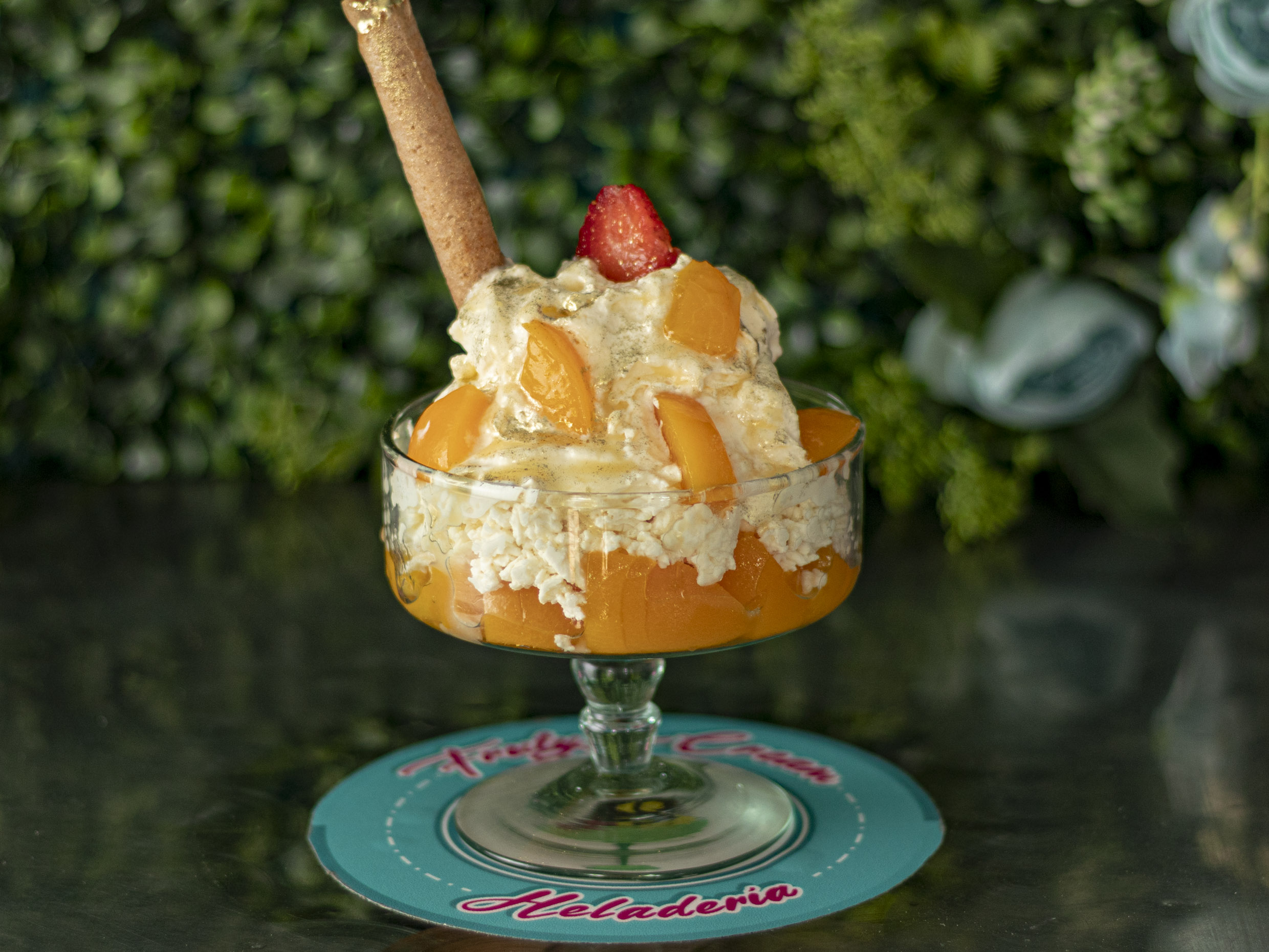 2 Bolas de helado, acompañado de durazno, delicioso queso, crema chantillí y leche condensada.