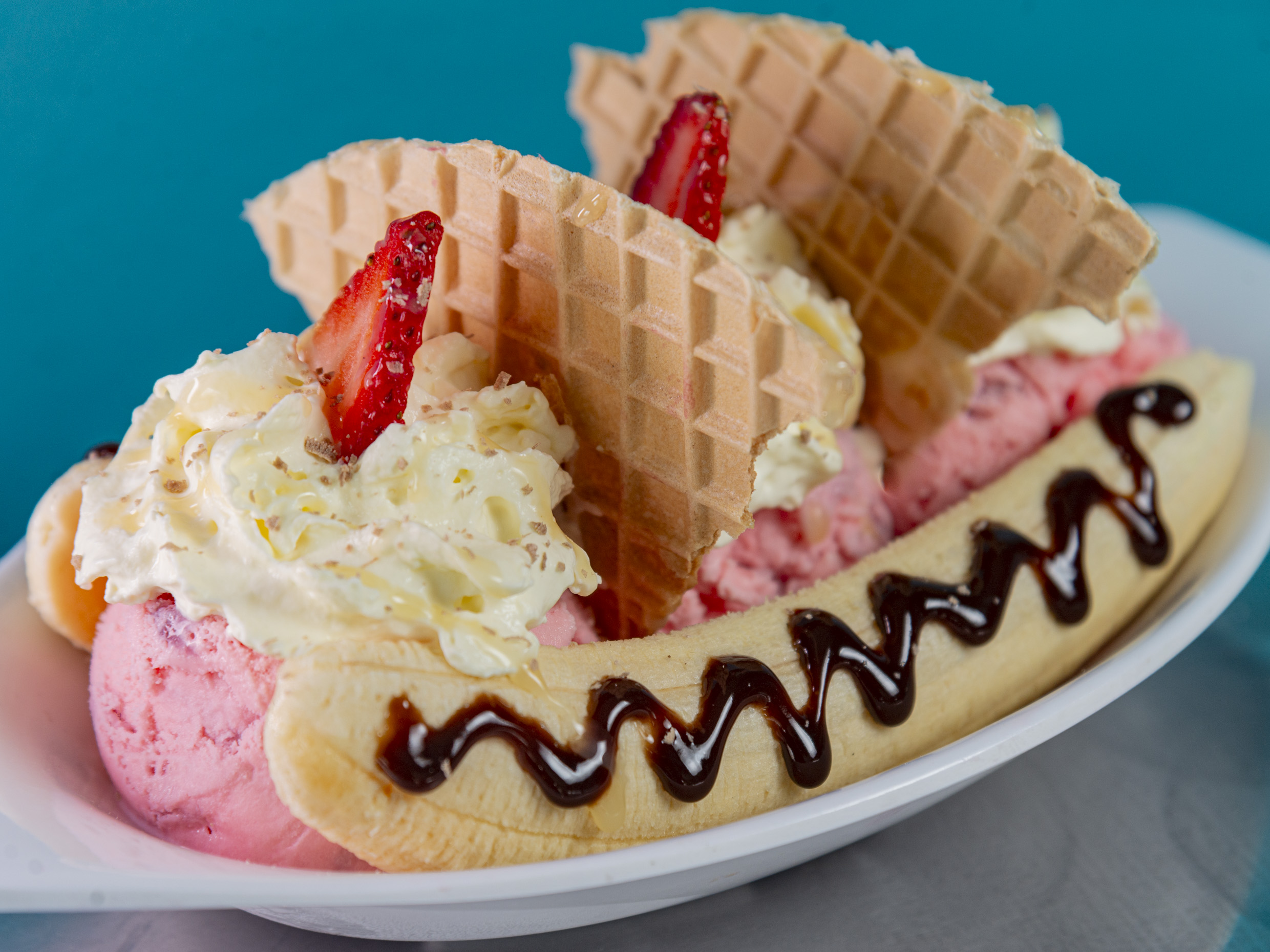 3 Bolas de helado acompañado de banano, crema chantillí y salsas.