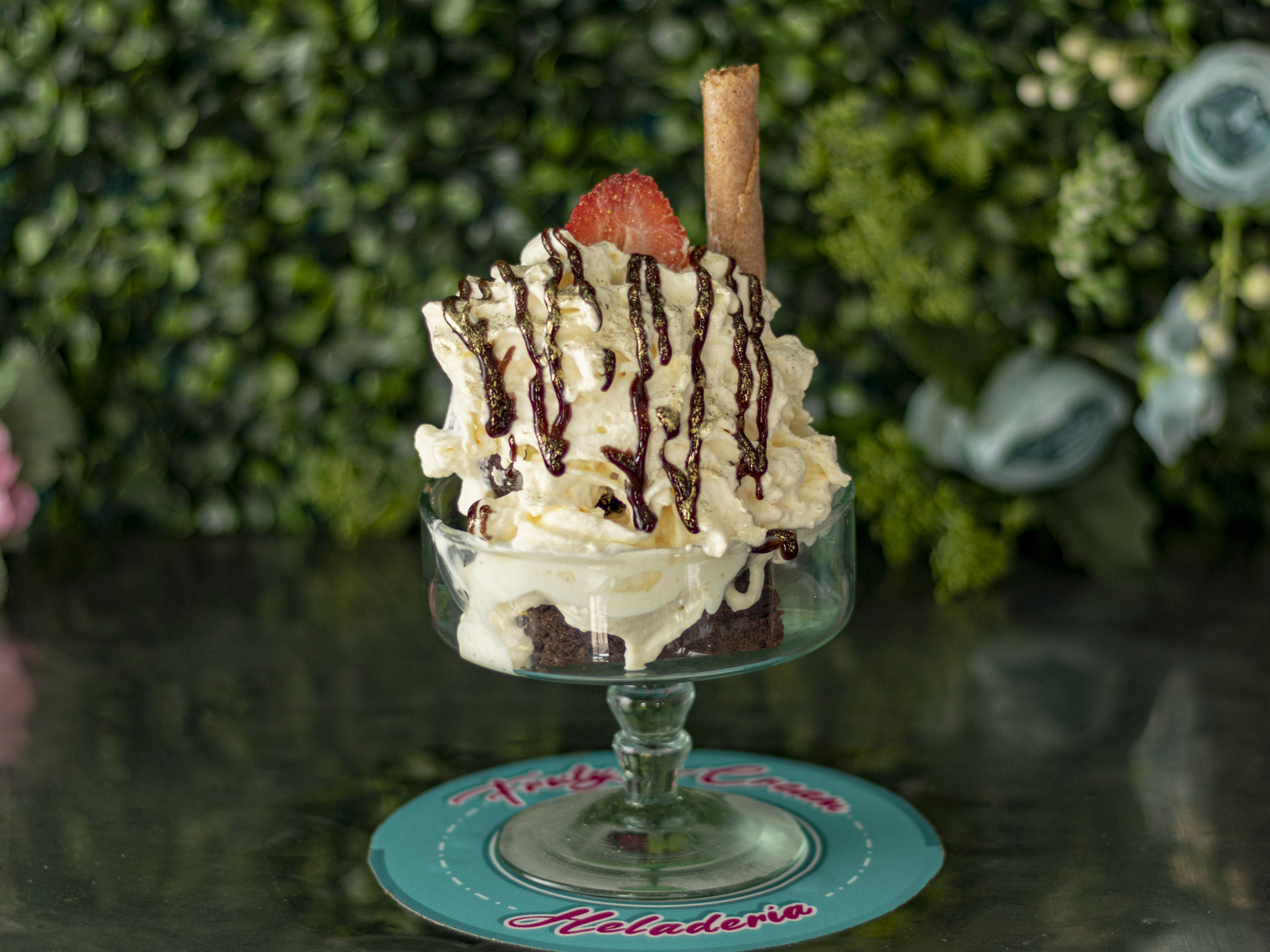 2 Bolas de helado, acompañado de brownie, crema chantillí y salsa de chocolate.