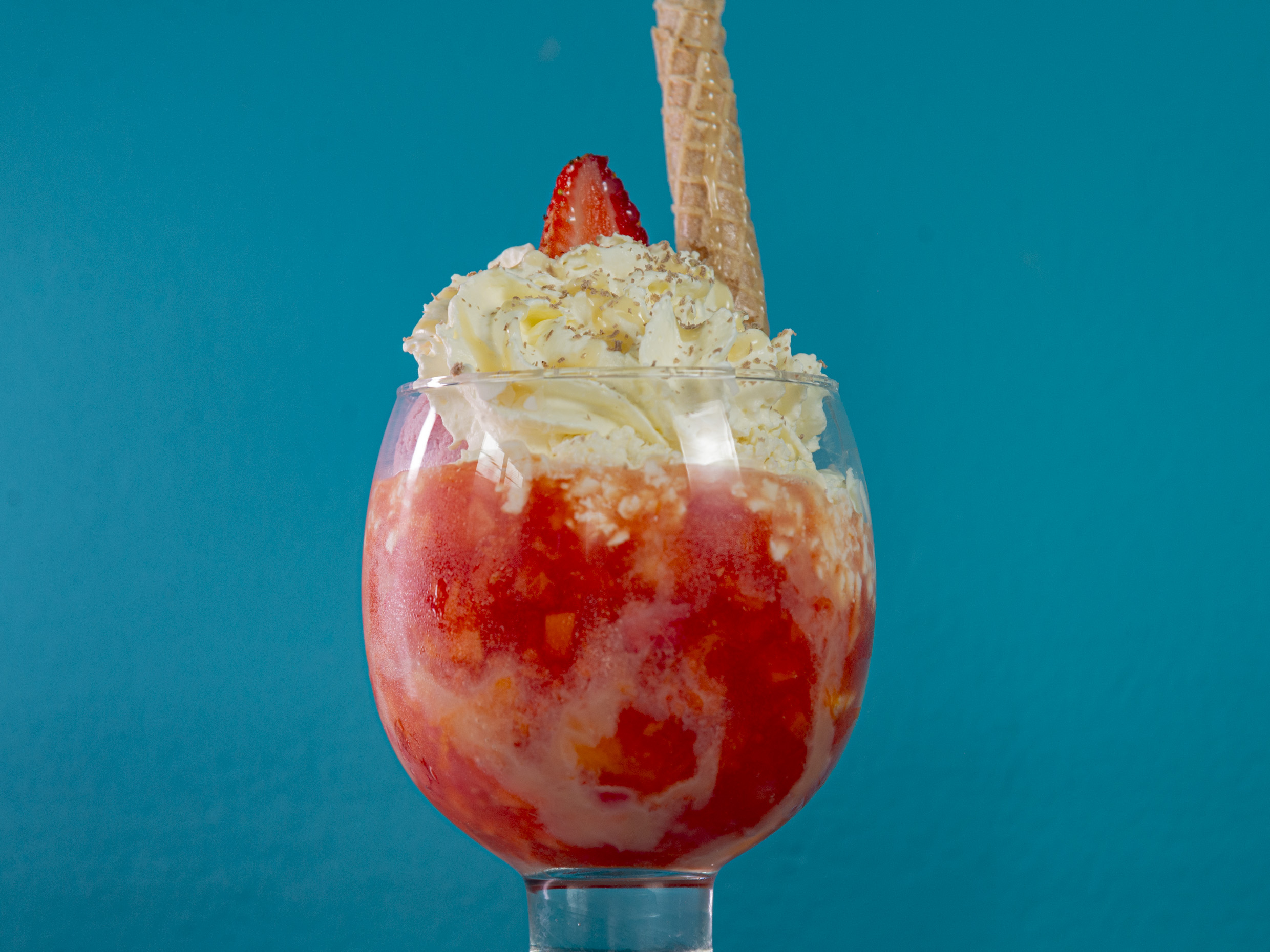 1 Bola de helado, salpicón, crema chantillí y leche condensada.