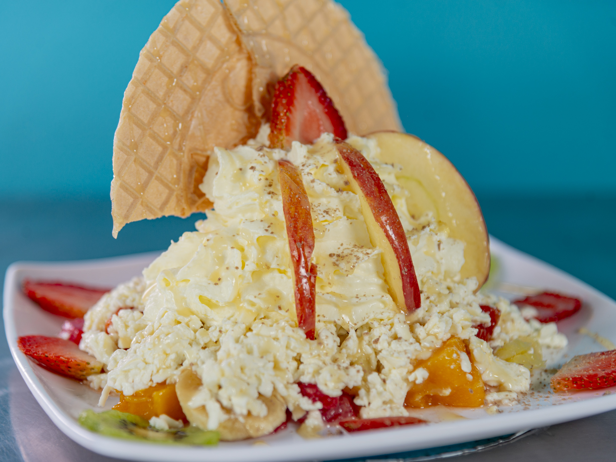 2 Bolas de helado acompañado de banano, manzana, fresa, mango, papaya, sandía, kiwi, piña, queso, crema chantillí, oblea y leche condensada.