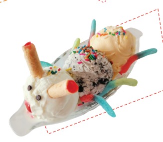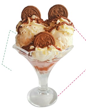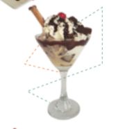 3 Sabores de helado, galleta Recreo, chantilly, salsa de chocolate y salsa Hershey´s.