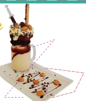 Deliciosa malteada, brownie, chantilly, bolitas de chocolate, Mini Chips, barquillo y lluvia de chocolate.