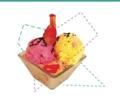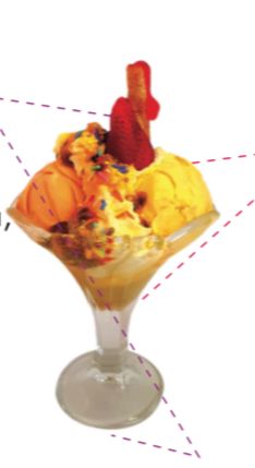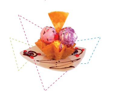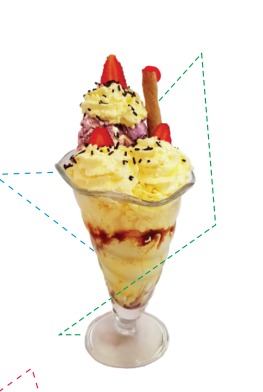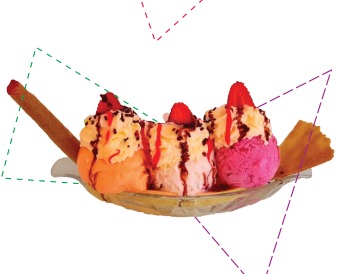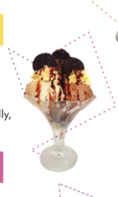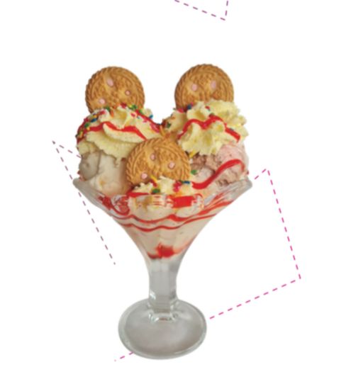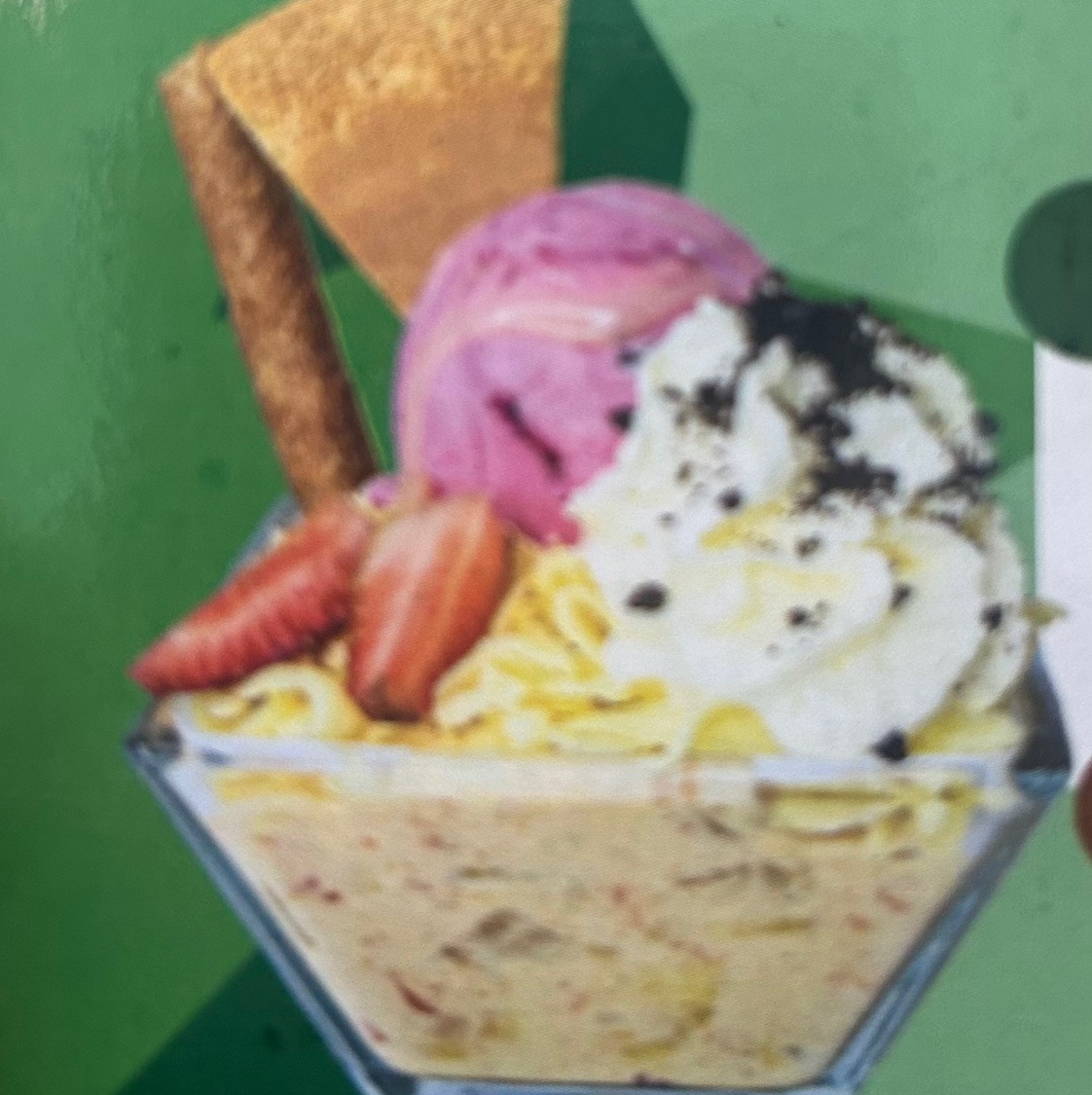 2 Sabores de helado, combinado con leche condensada, crema chantilly, dos sabores suaves de gelatina, barquillo, lluvia de colores.
