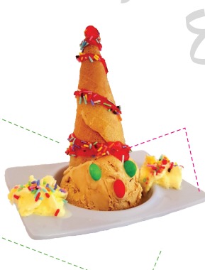 2 Sabores de helado, queso, chantilly, leche condensada, barquillo, lluvia de chocolate y salsa de chocolate.