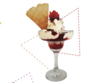 Para los amantes de los frutos rojos, 2 sabores de helado, bañados con salsa de frutos rojos de la casa, crema chantilly, galleta abanico, fresa y lluvia de chocolate.
