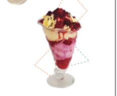 1 Sabor de helado, mezcla de frescas frutas, crema de leche, queso, barquillo, lluvia de chocolate y chantilly.