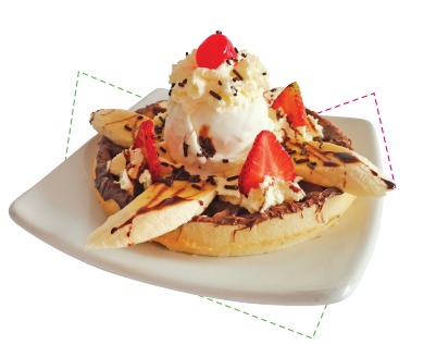 Exquisito waffle bañado con la deliciosa Nutella, fresa, banano, el sabor de helado de tu preferencia, una cereza y lluvia de chocolate.