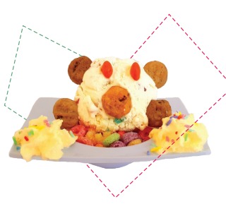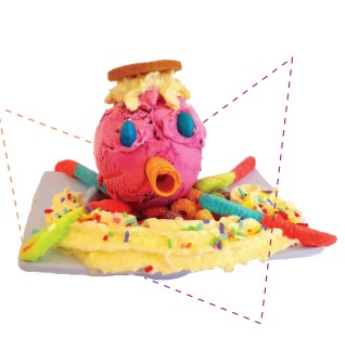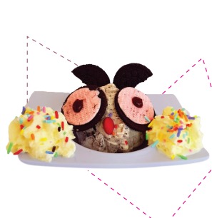 Presentación infantil con 1 sabor de helado decorado con gomas, lluvia de colores, galletas y crocante cereal.