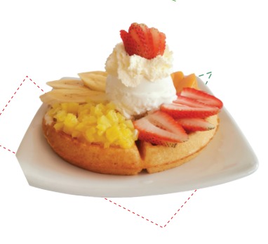 Para ti que buscas algo rico y saludable, un waffle acompañado con una provocativa combinación de frutas; piña, fresa, durazno, un sabor de helado y chantilly.