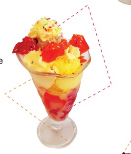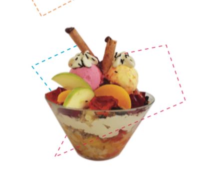 2 Sabores de helado, mezcla de frescas frutas, crema de leche, queso, barquillo, lluvia de chocolate y chantilly.