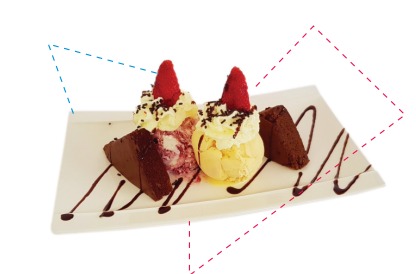 2 Sabores de helado, brownie caliente, fresa, chantilly, lluvia de chocolate y salsa de chocolate.
