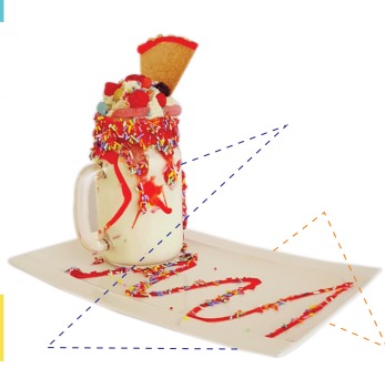 Deliciosa malteada de tu sabor favorito, lluvia de colores, salsa de fresa, chantilly, gusanitos, M&M, moritas y abanico.