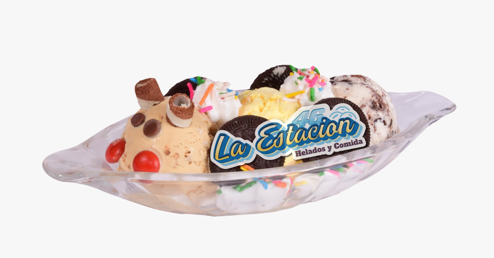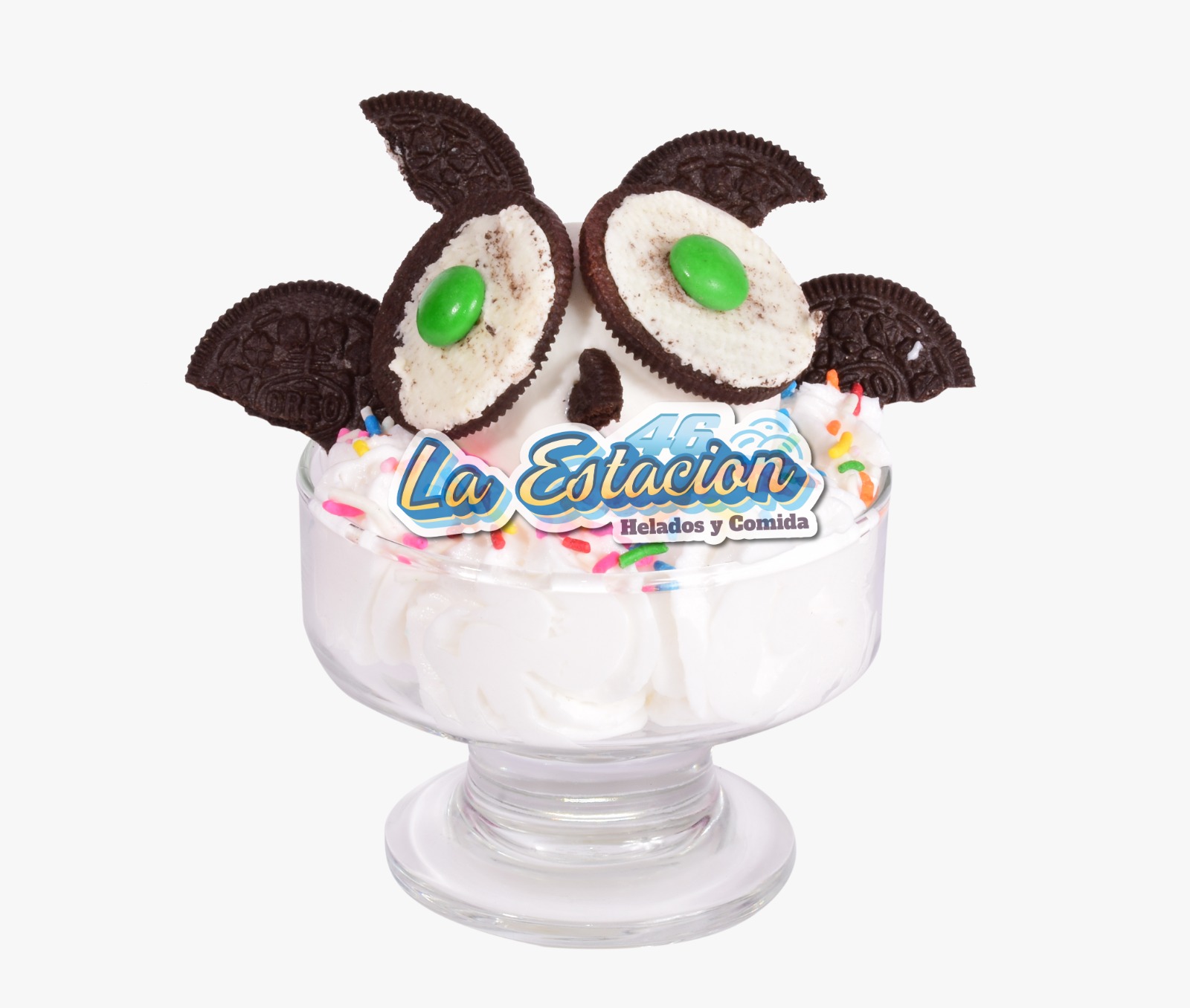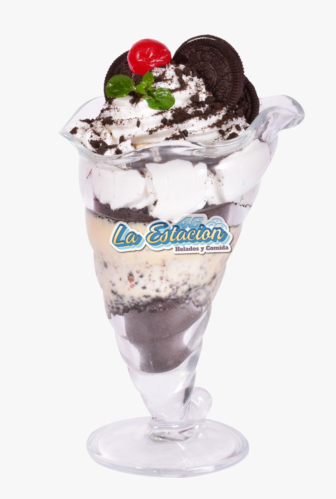 Ingredientes: dos sabores de helado, galleta oreo, oreo triturado, salsa de la casa, chantilly y cereza.
